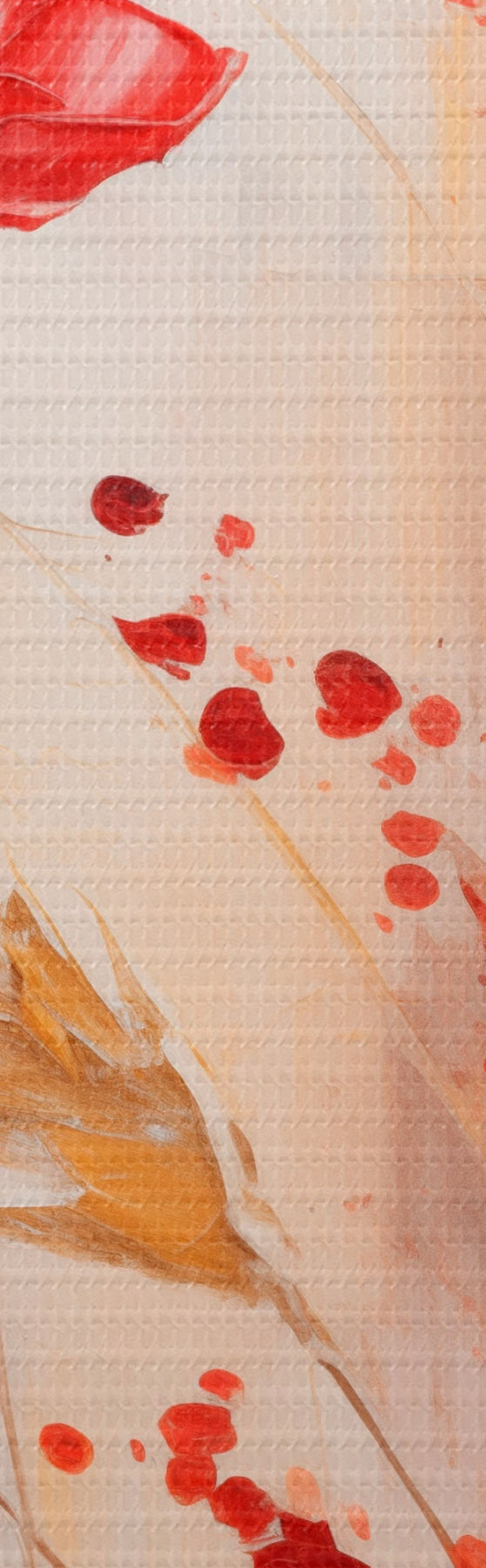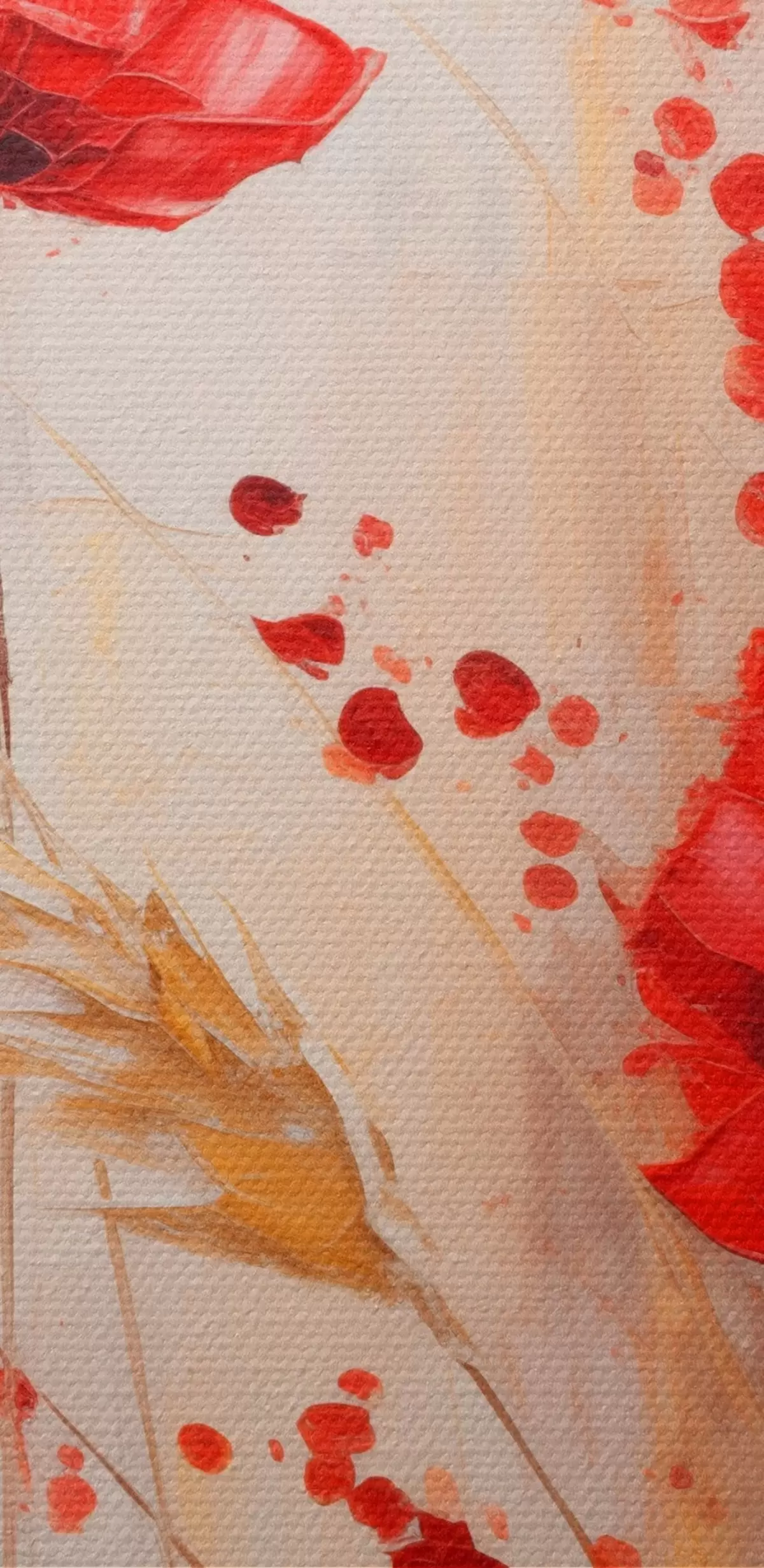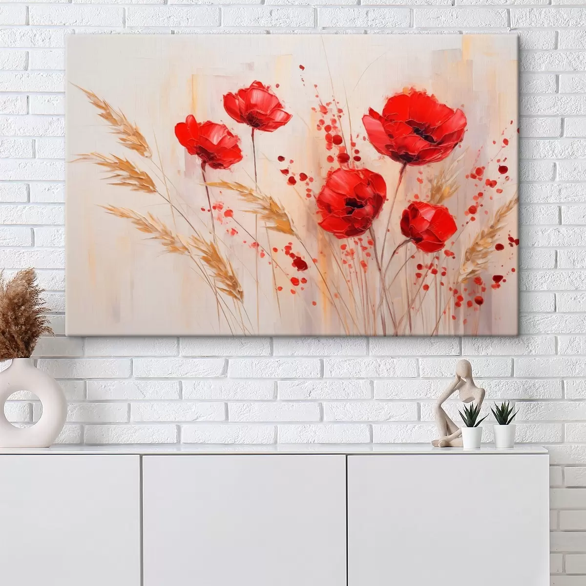 Obraz Červené květy máku se žlutými stonky pšenice na měkkém neutrálním pozadí s cákanci červené barvy Č. s44926