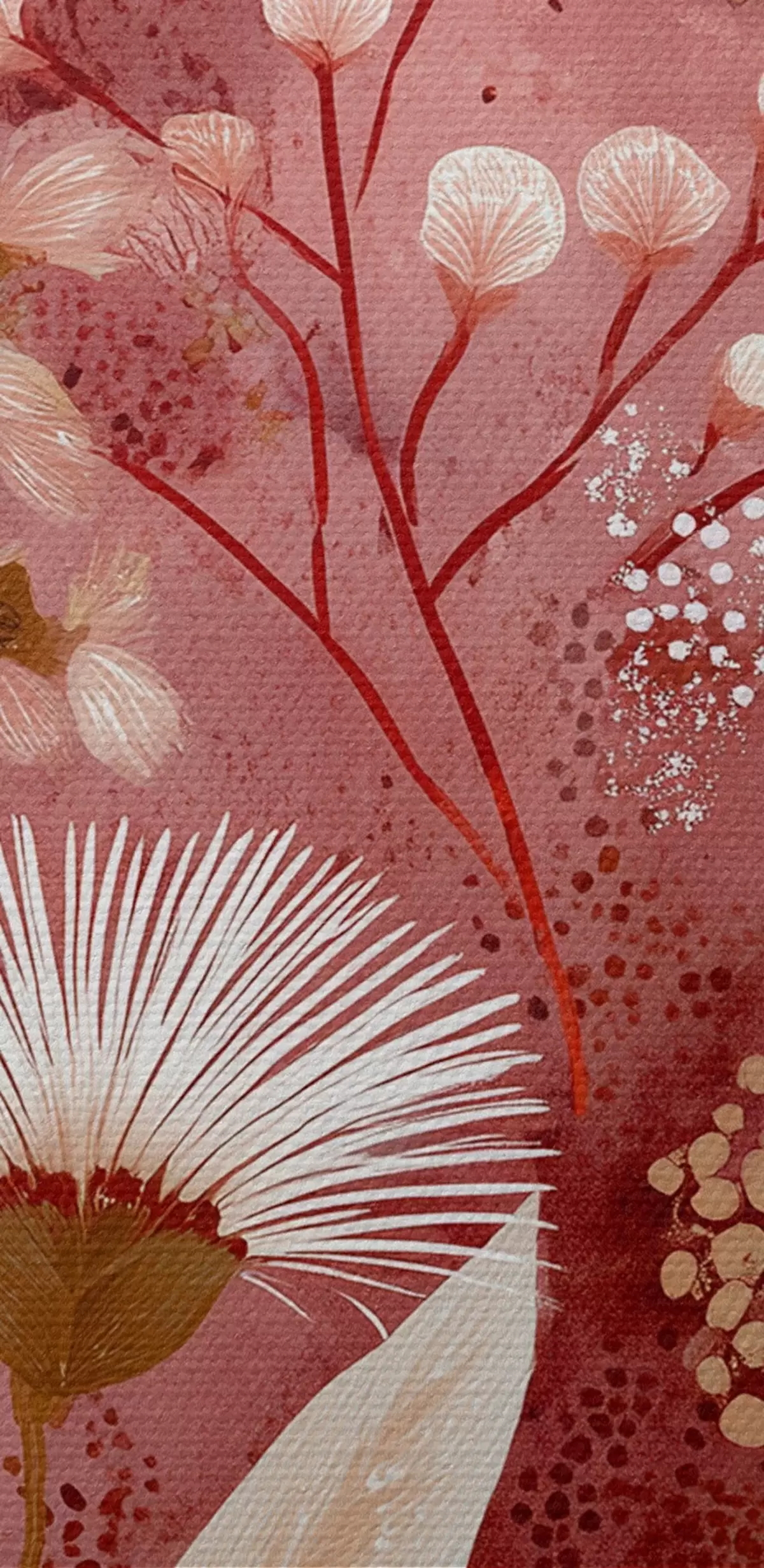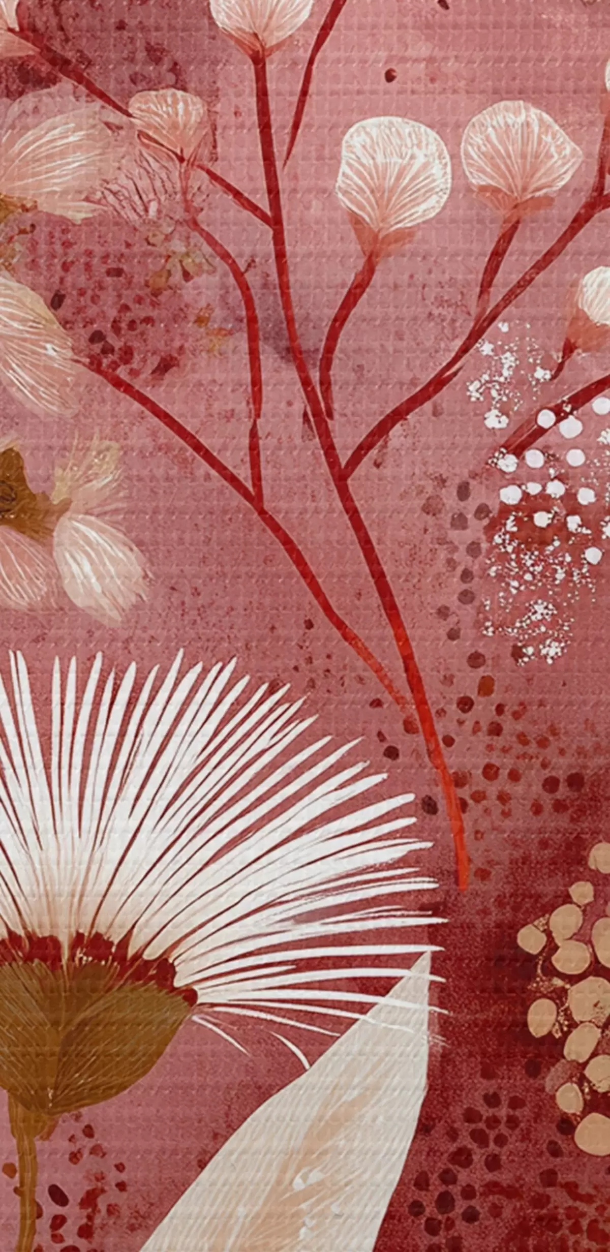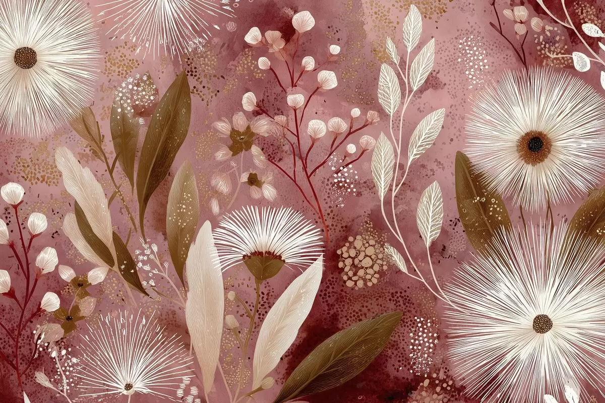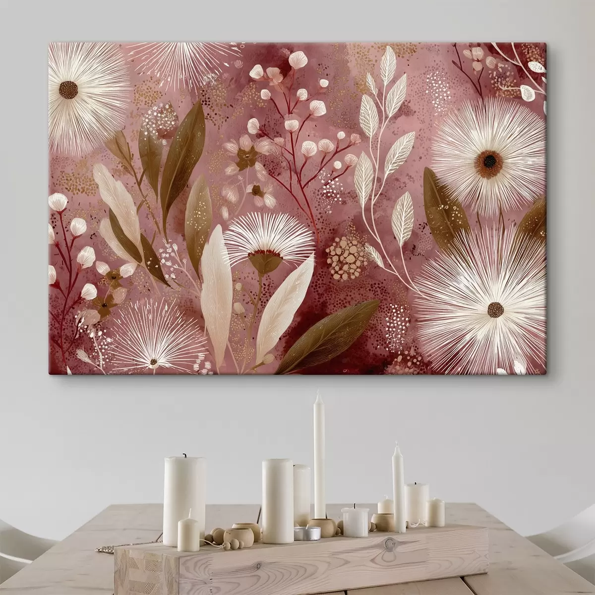 Obraz Bílé květiny v boho stylu na červeném pozadí, detailní kresba Č. s44979