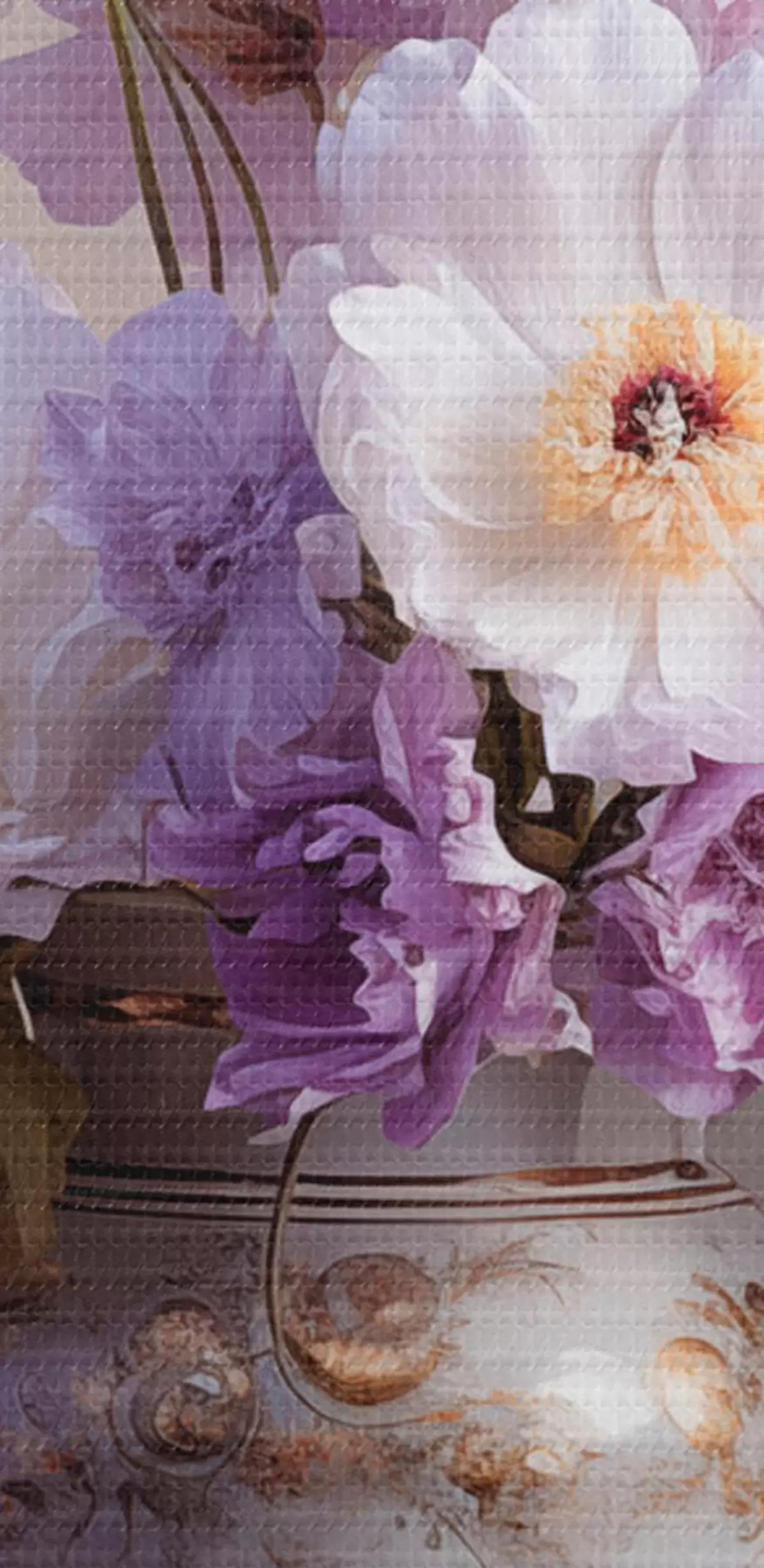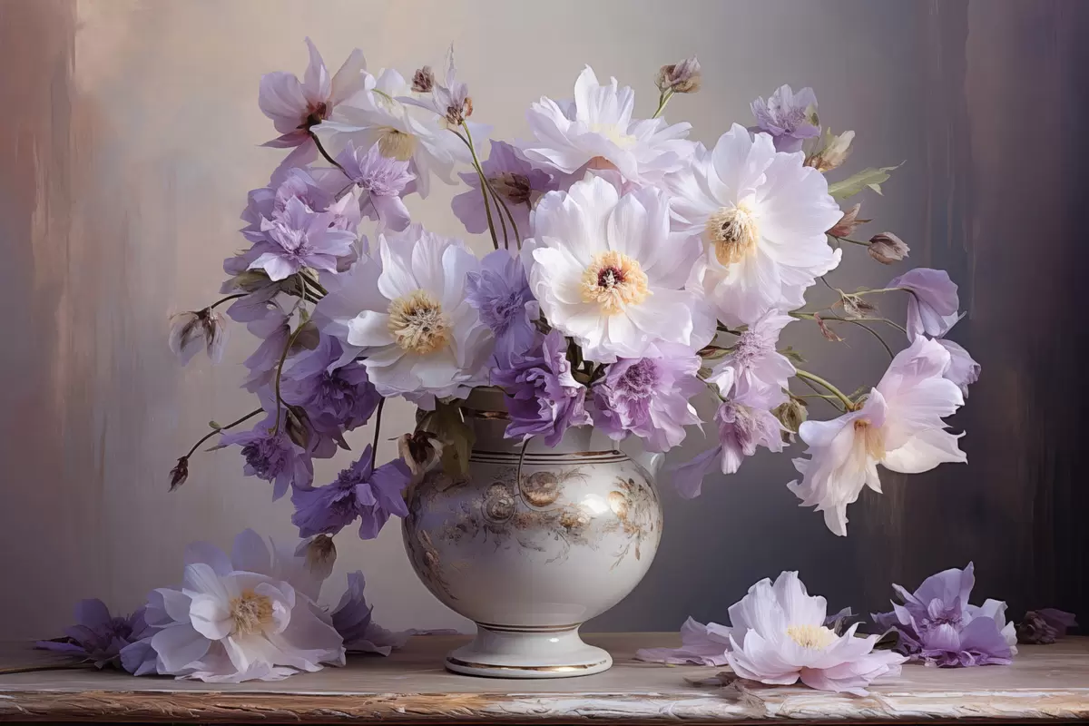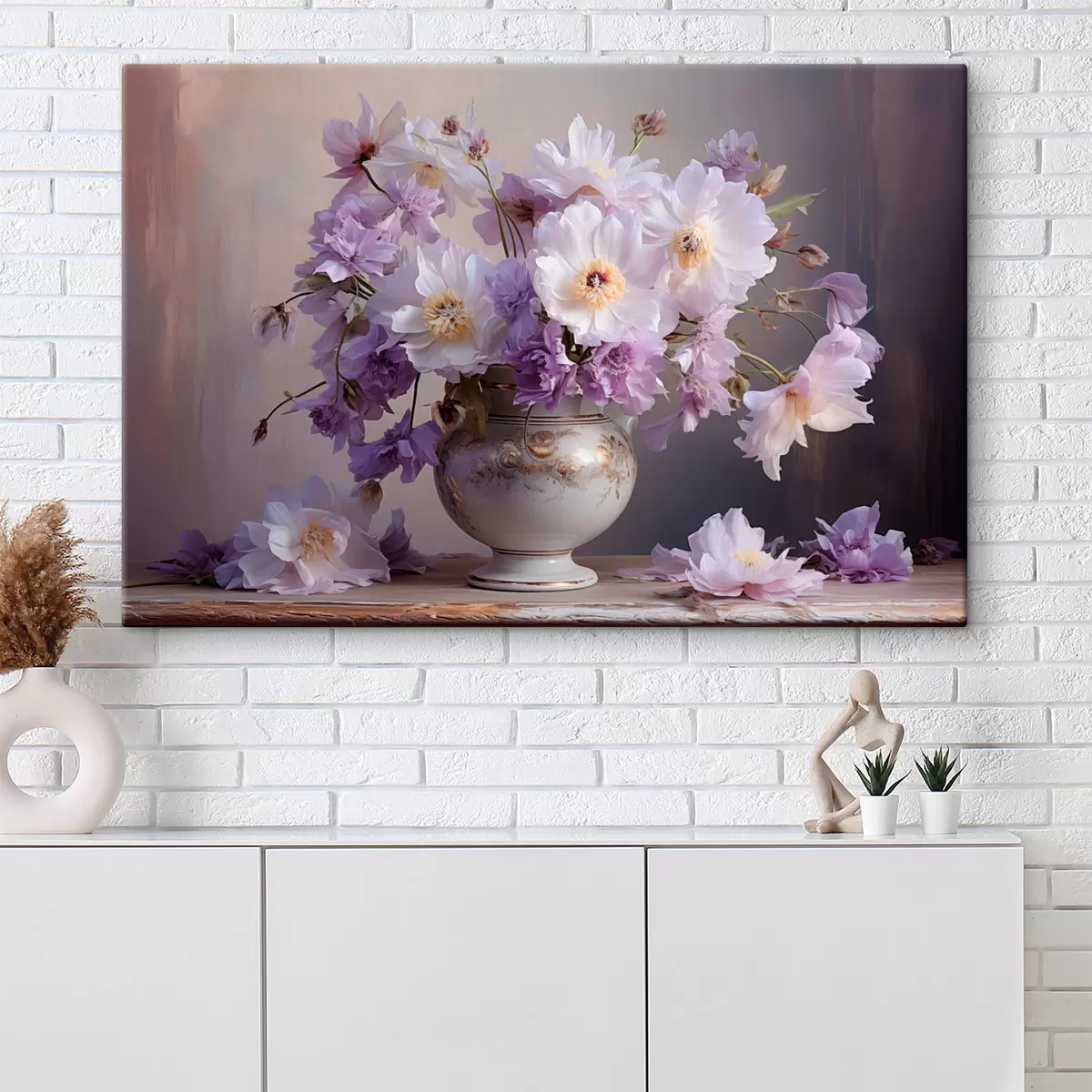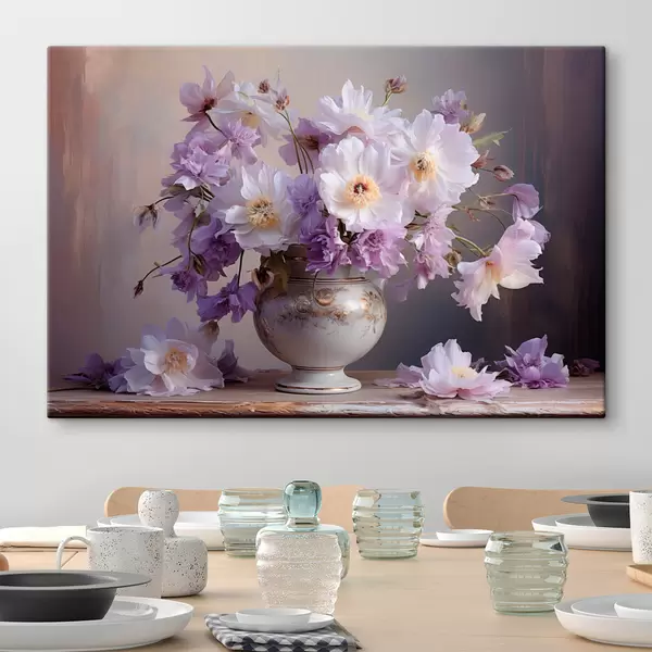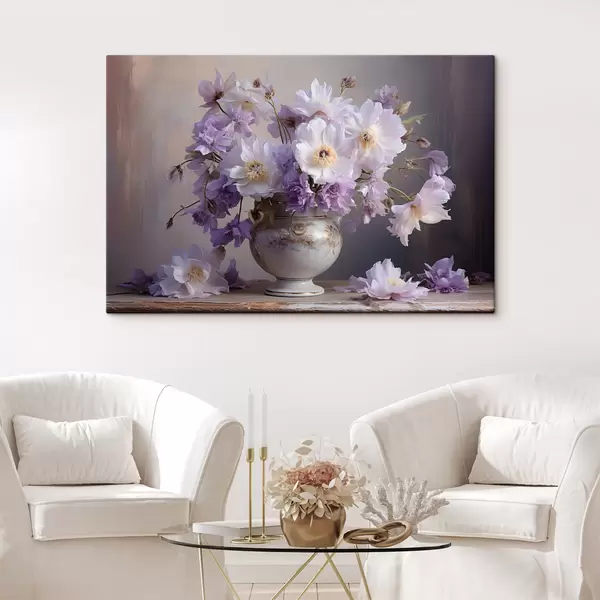 Obraz Květinové zátiší: bílé a fialové květy v uměleckém stylu Č. s45058