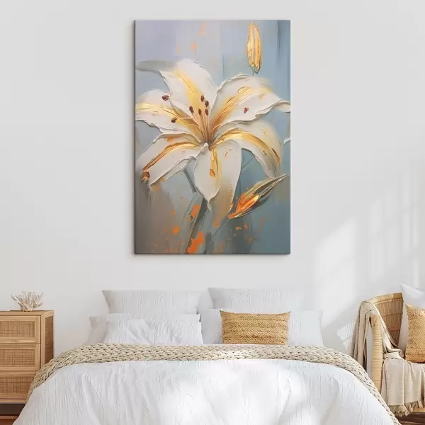 Obraz Bílá lilie se žlutými tahy na modrém pozadí Č. s45077