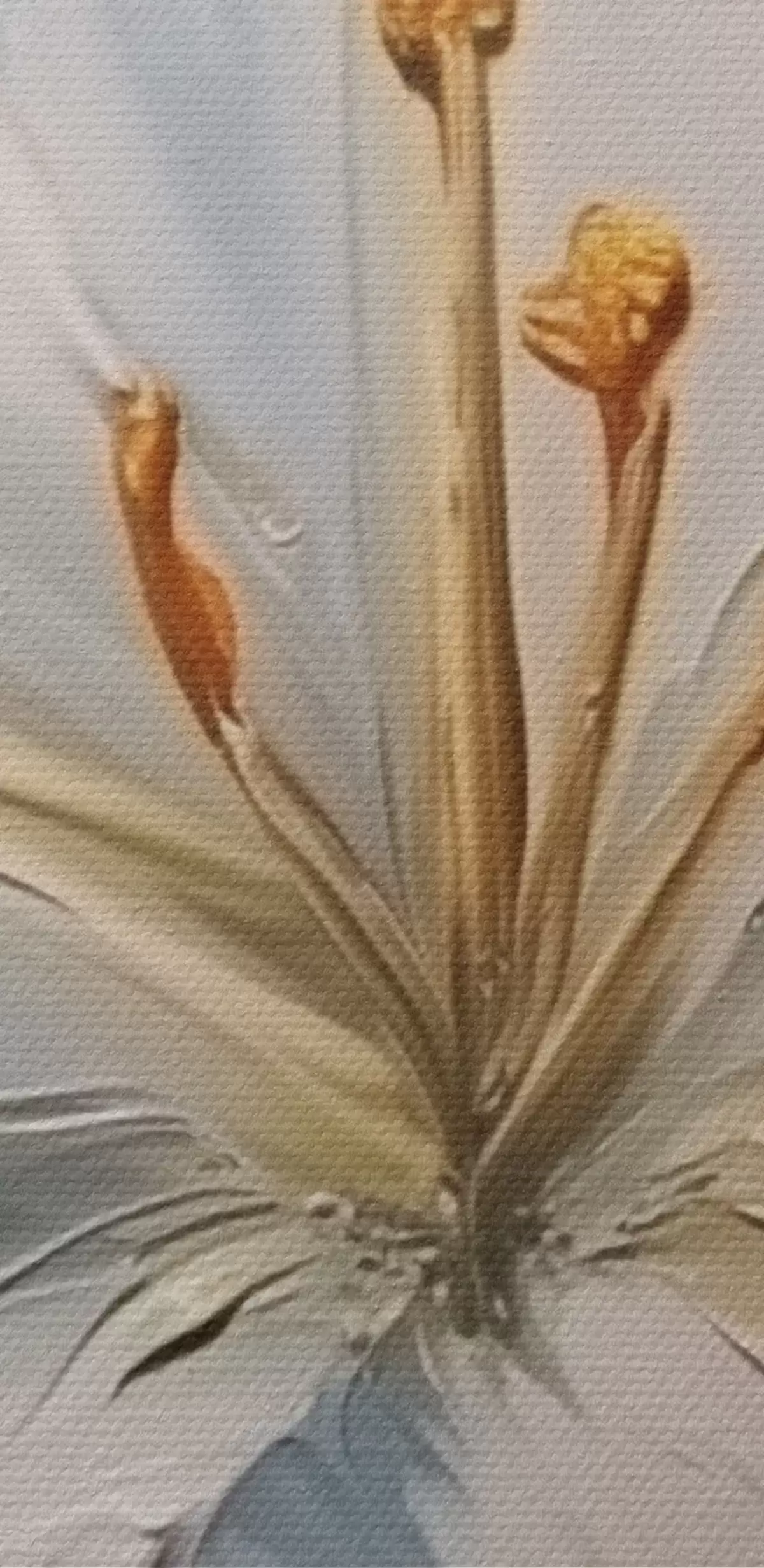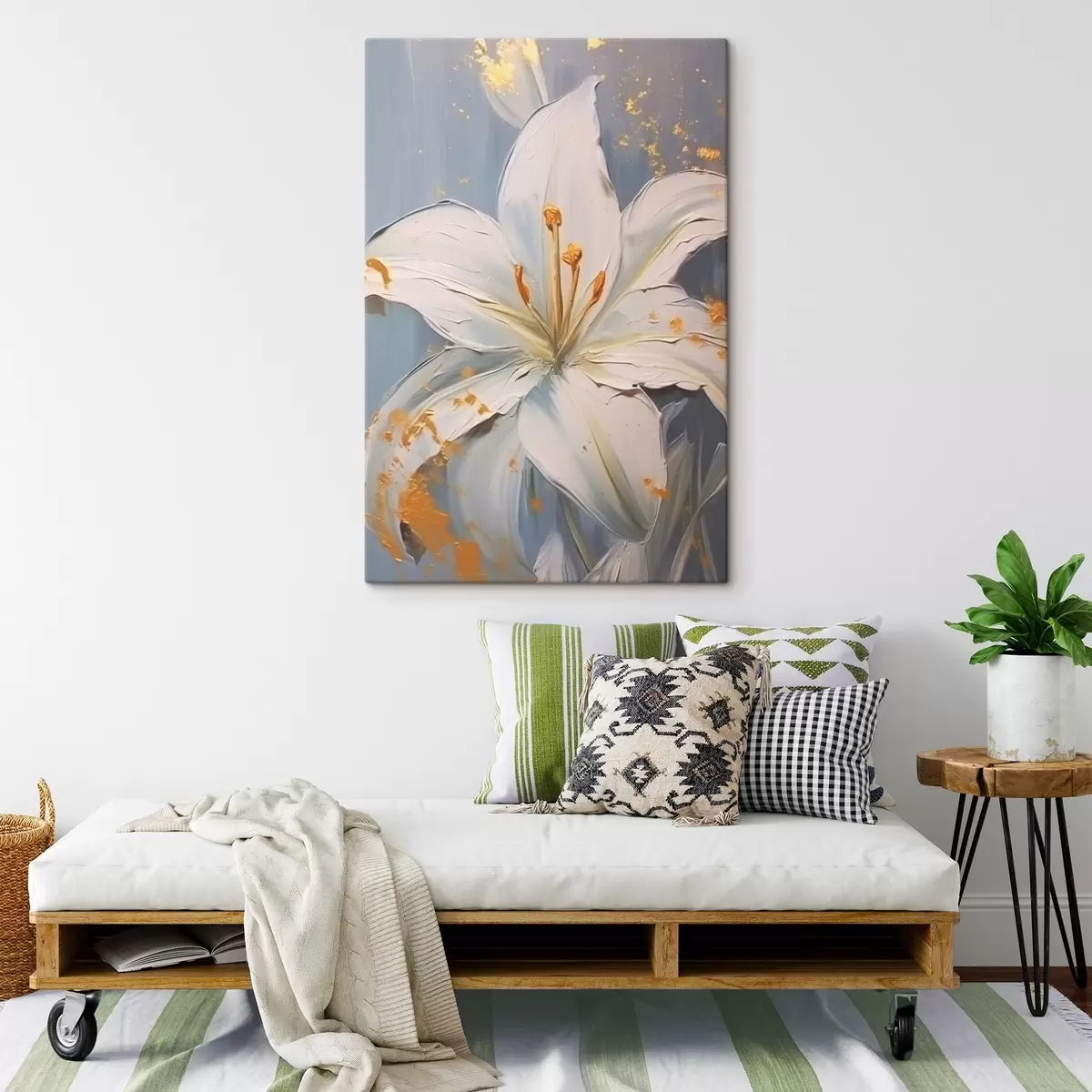 Obraz Bílá lilie se žlutými akcenty na modrém pozadí Č. s45078