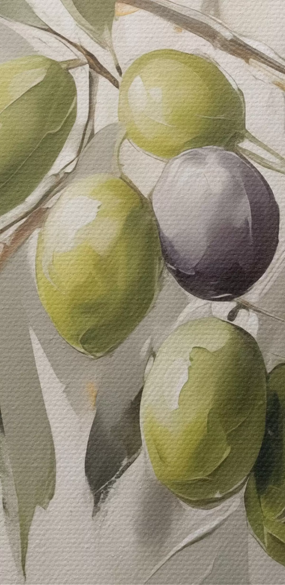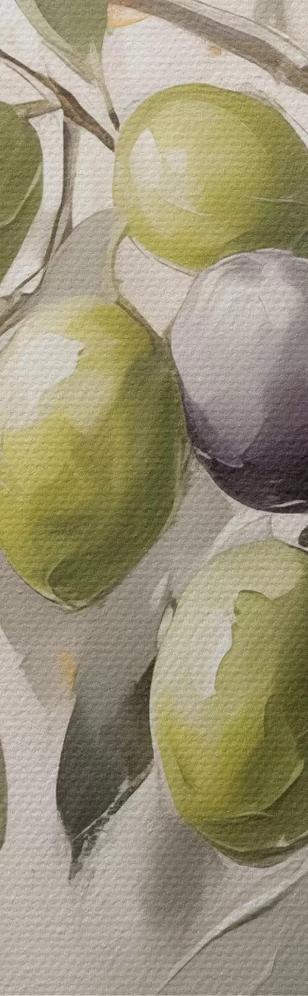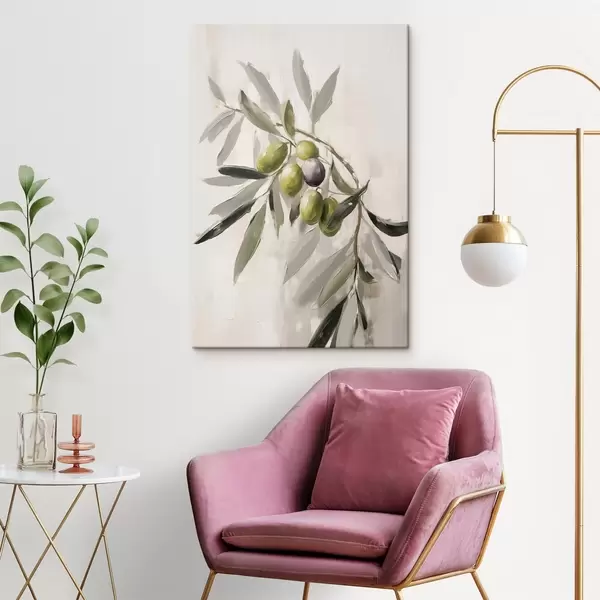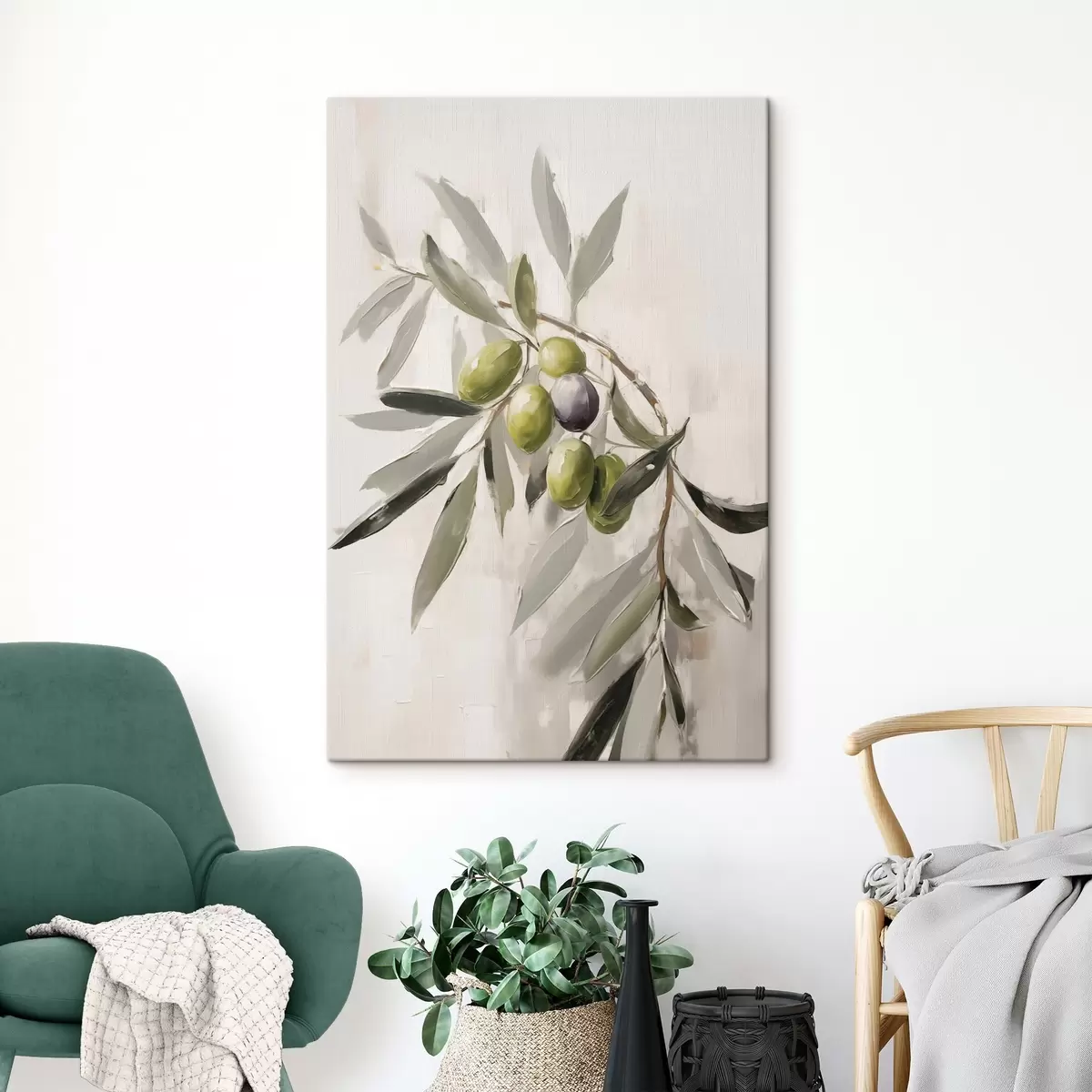 Obraz zelené olivy, detail větve, světlé pozadí, organické, přírodní paleta, rustikální Č. s45110
