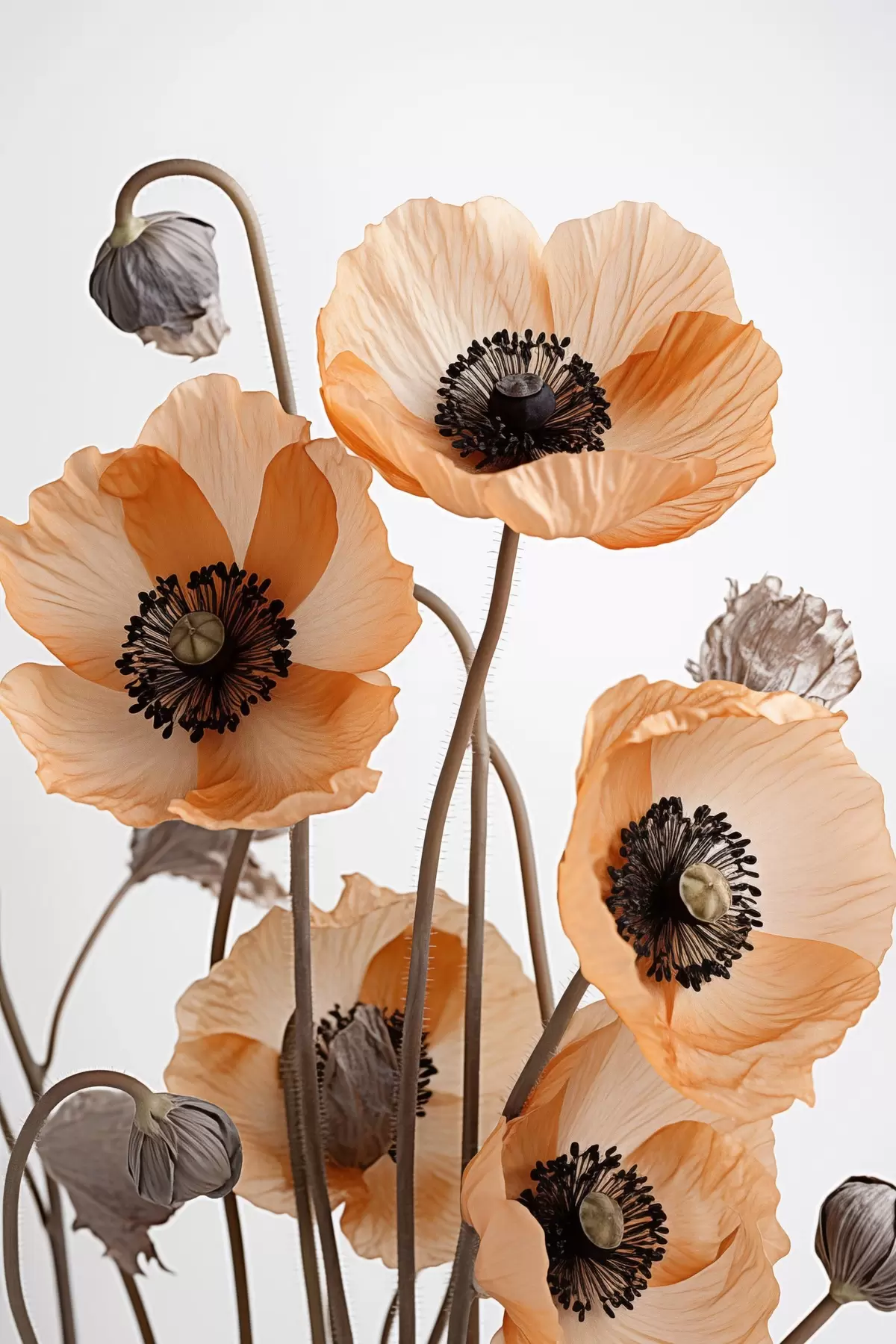 Obraz Oranžové máky, sušené květiny na světlém pozadí, měkké osvětlení, jemné okvětní lístky, květinové aranžmá Č. s45167