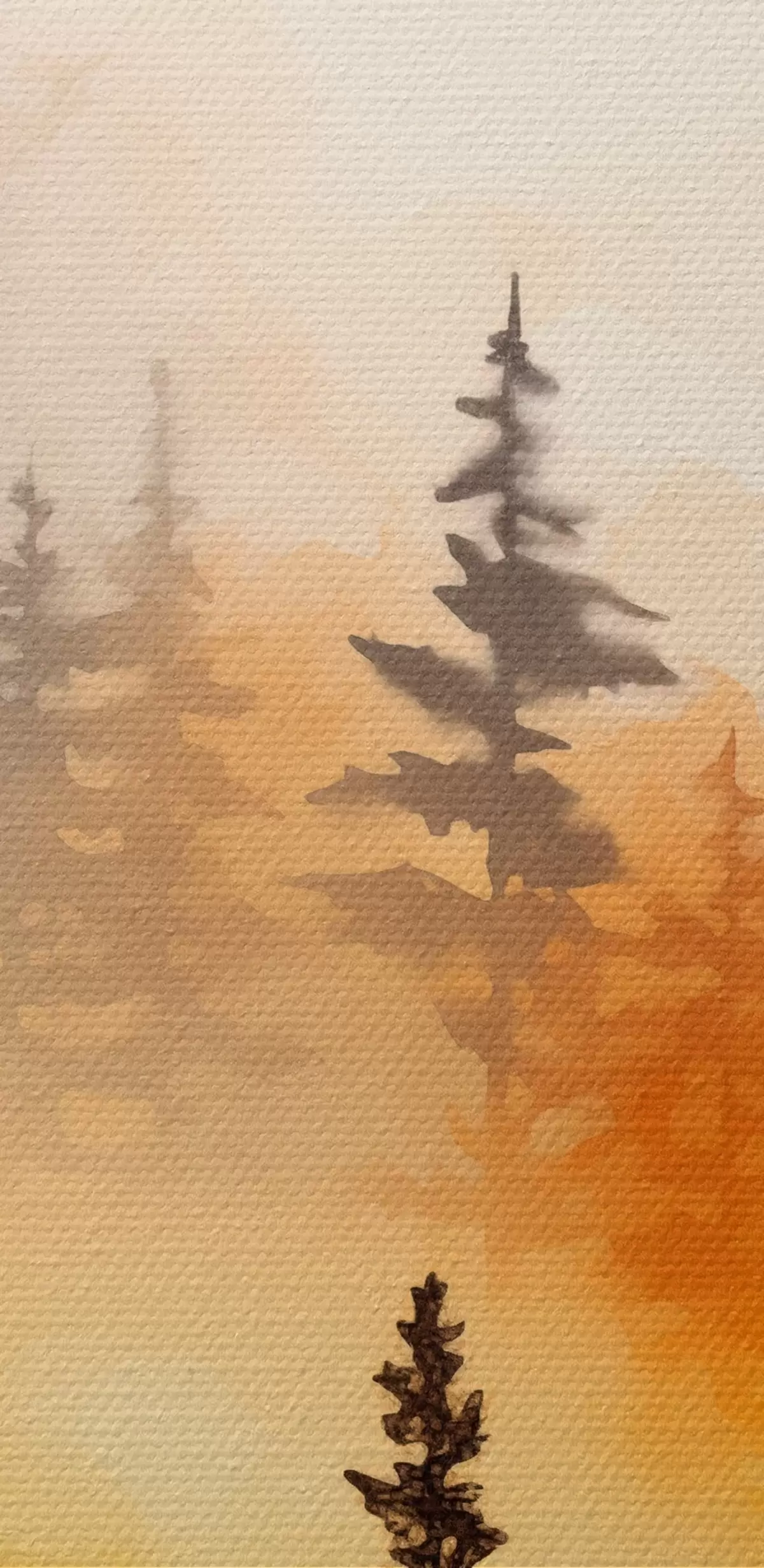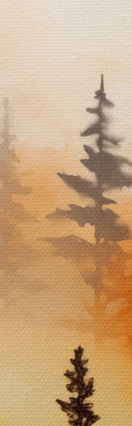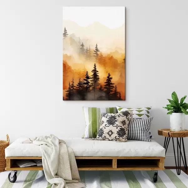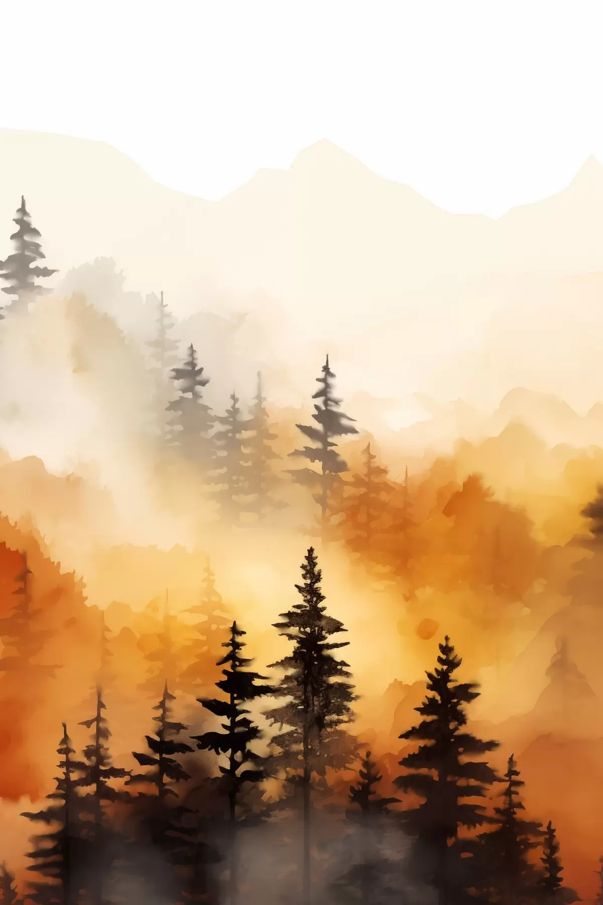 Obraz Akvarelová malba krajiny imitující les s vysokými borovicemi a horami v pozadí Č. s45170