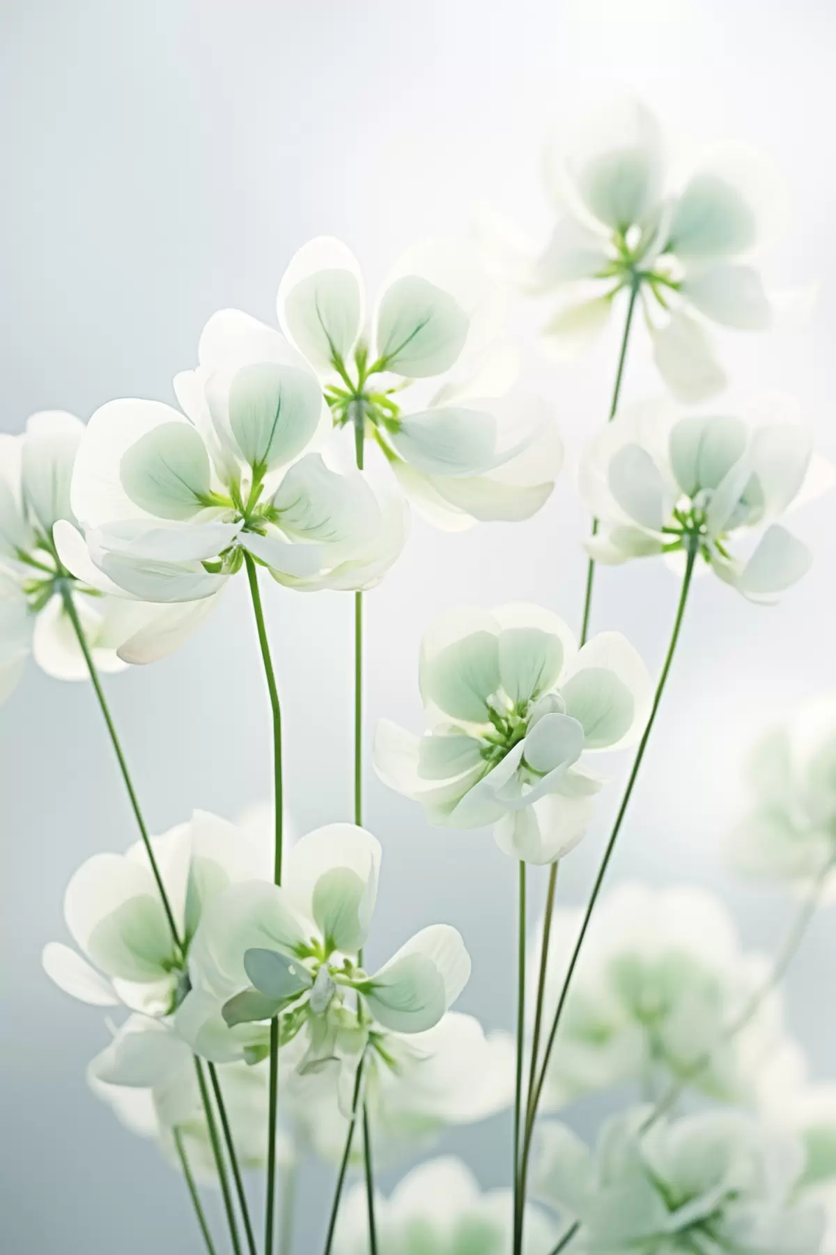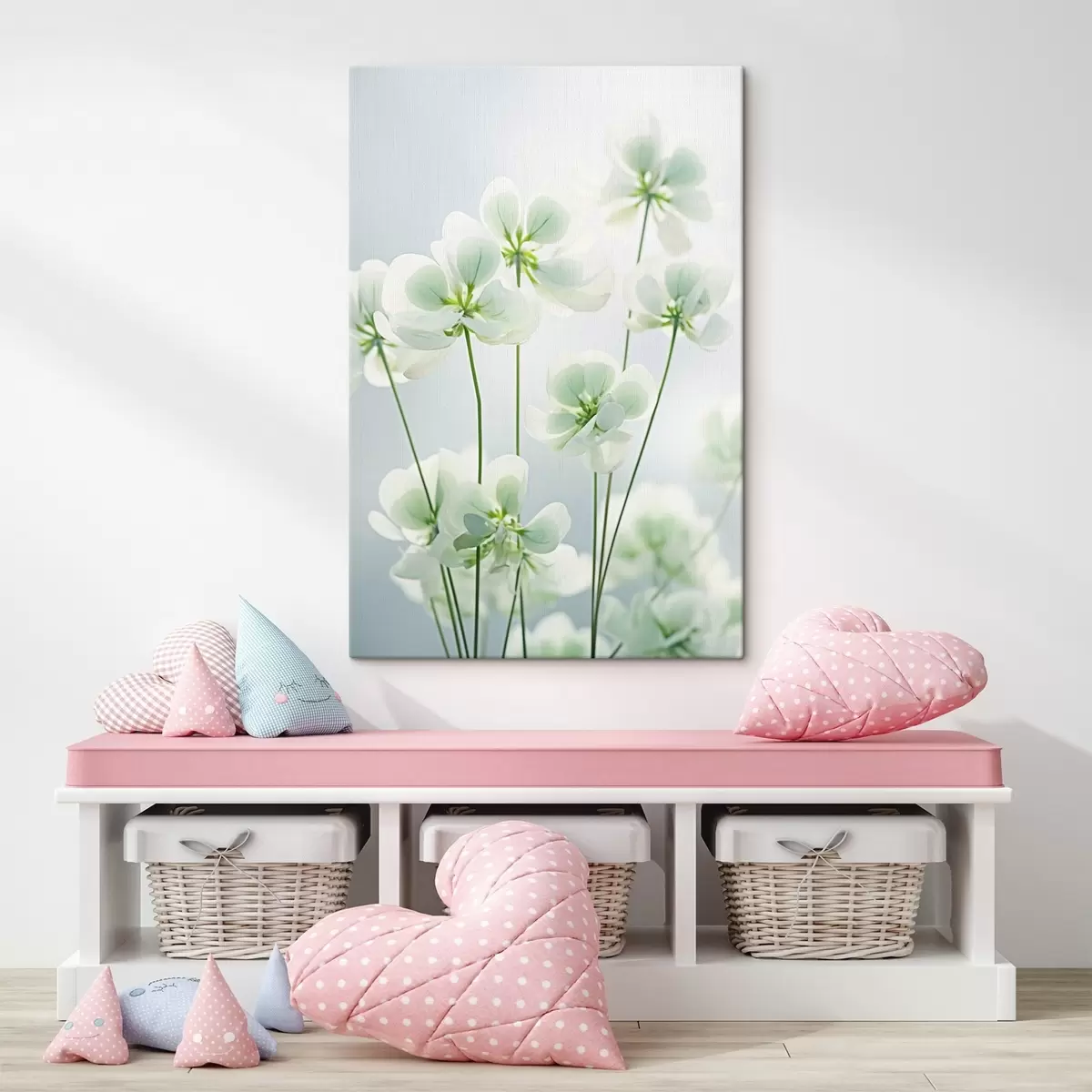 Obraz Bílé jetelové květy se zeleným stonkem a listy, měkké osvětlení, čisté pozadí, minimalistická kompozice, botanické motivy Č. s45172