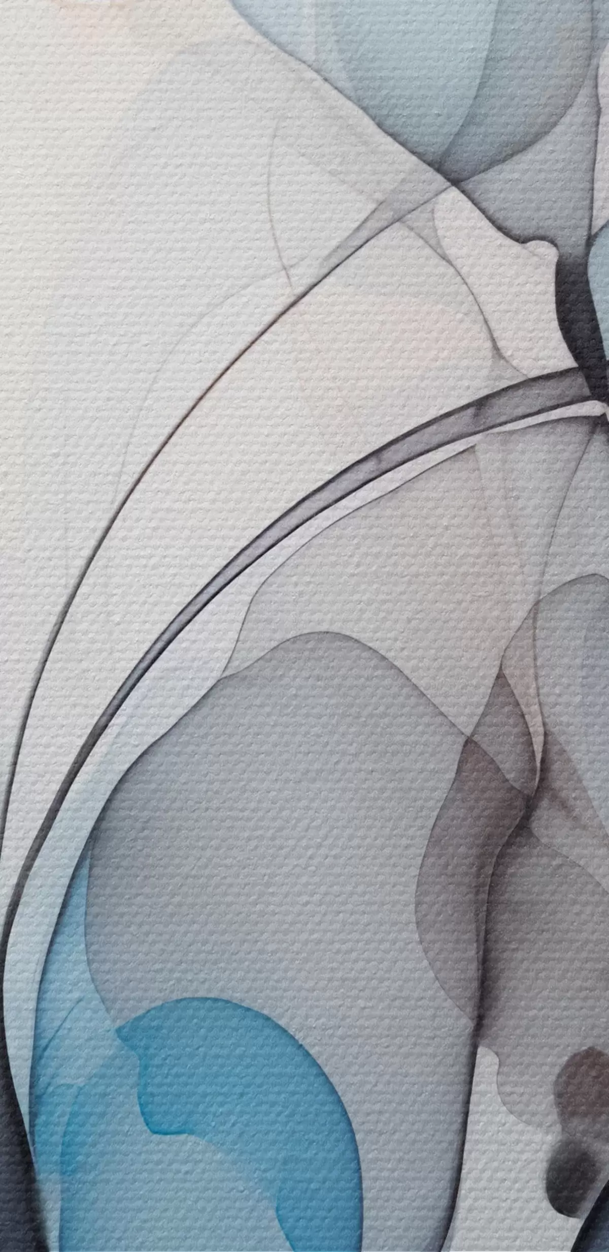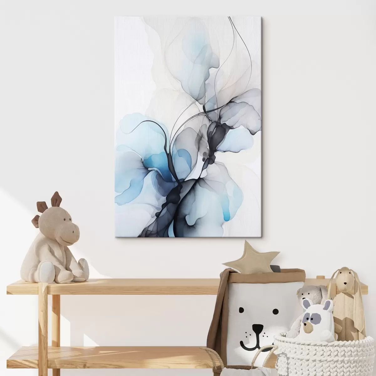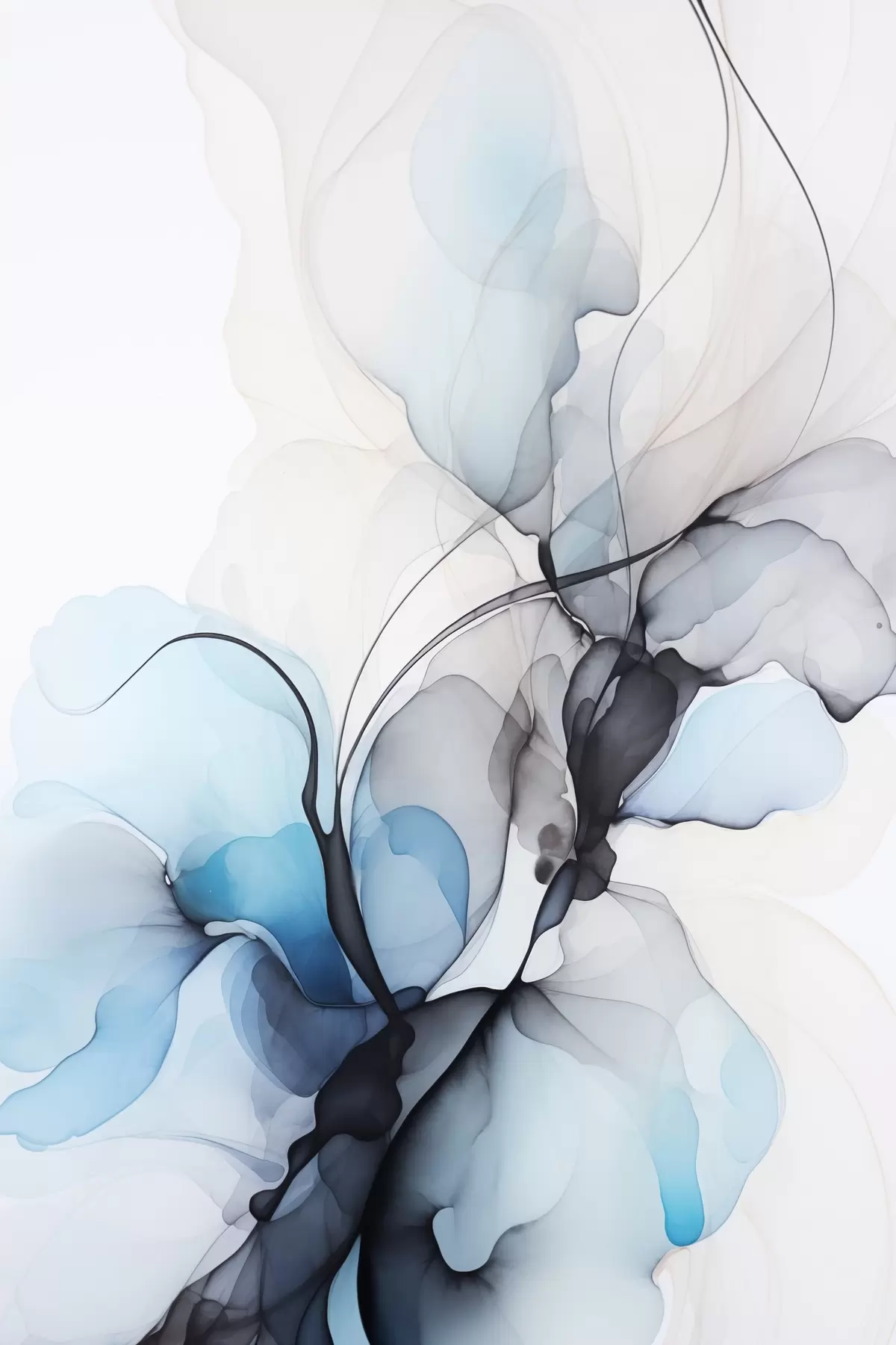 Obraz Abstraktní kompozice s plynulými liniemi a průsvitnými okvětními lístky v odstínech modré, bílé a béžové, imitace lihového inkoustu Č. s45177