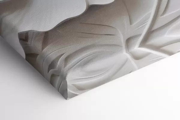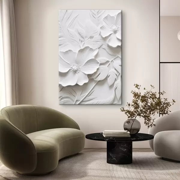 Obraz Dekorativní minimalistické bílé květy s listy, imitace reliéfu, bílé pozadí Č. s45180