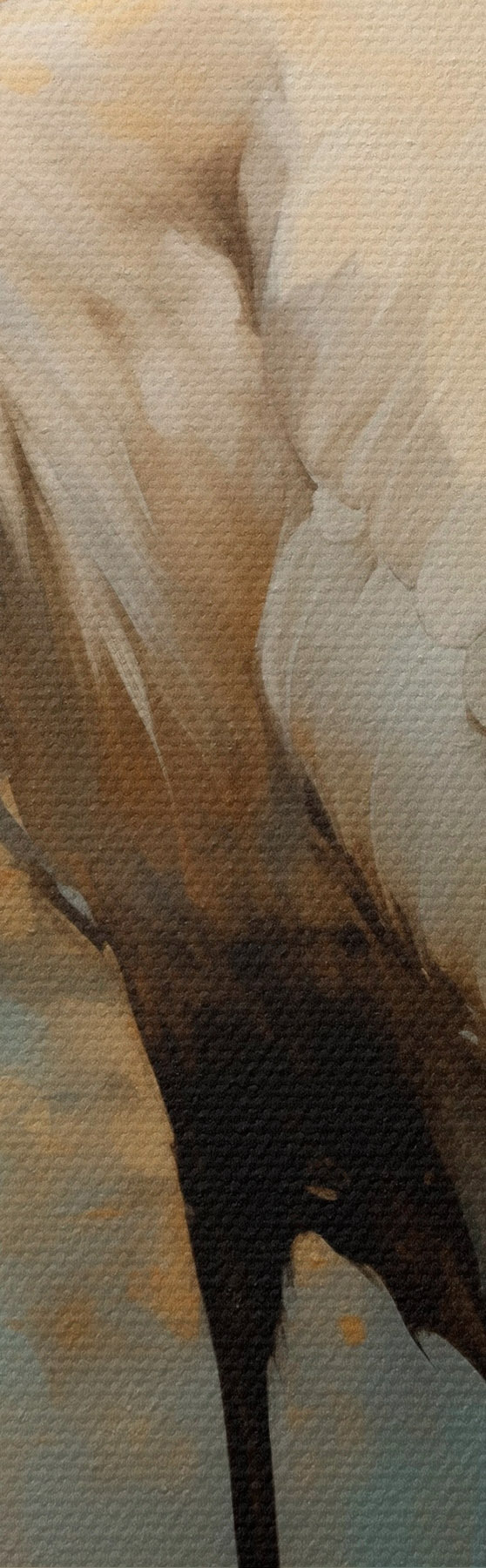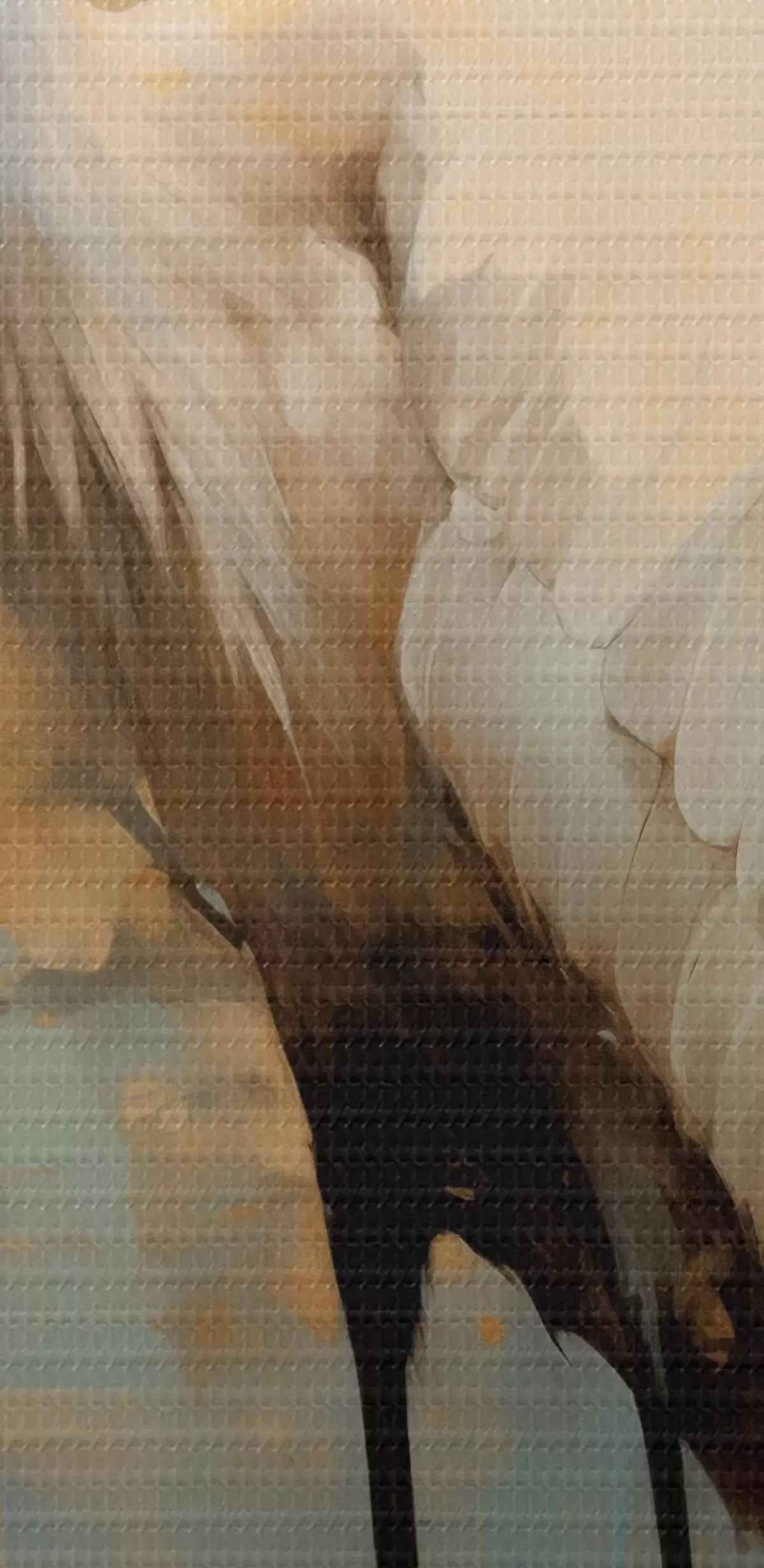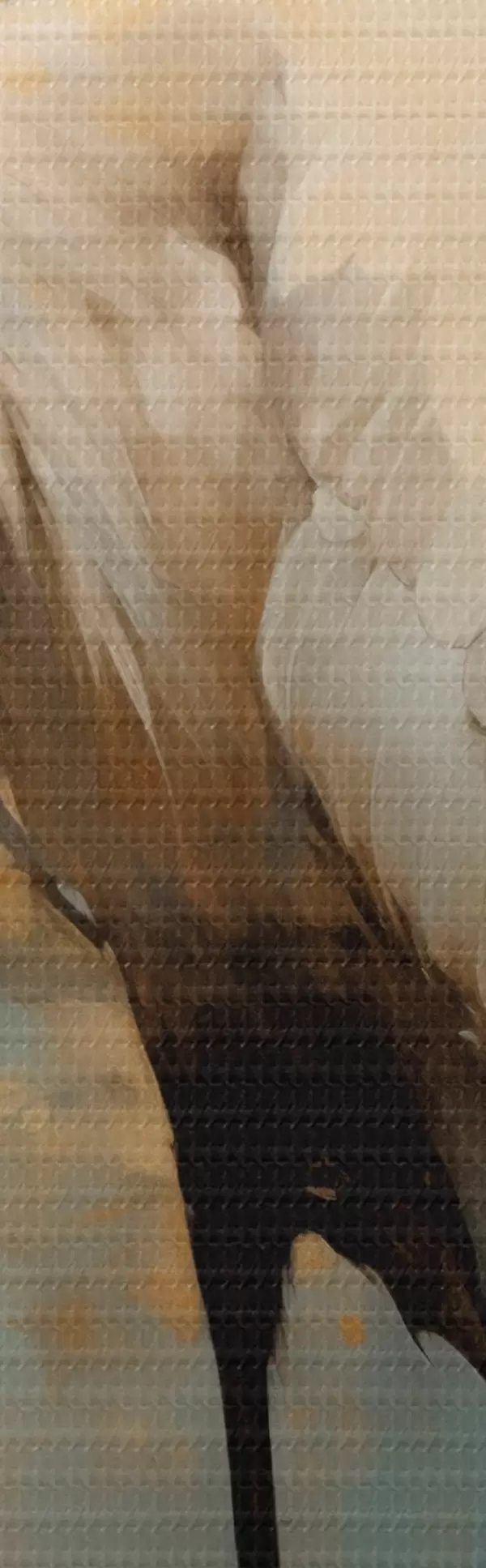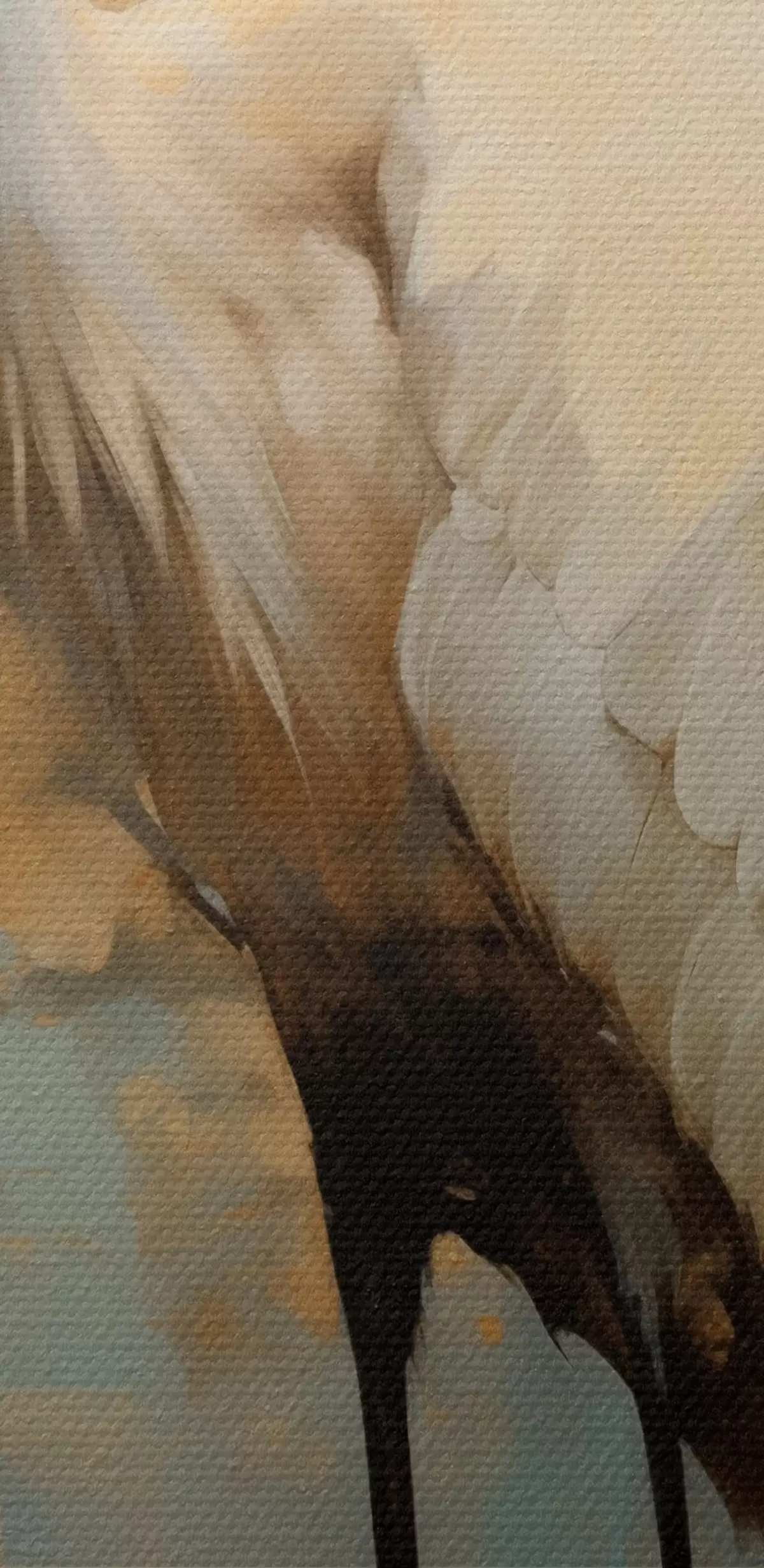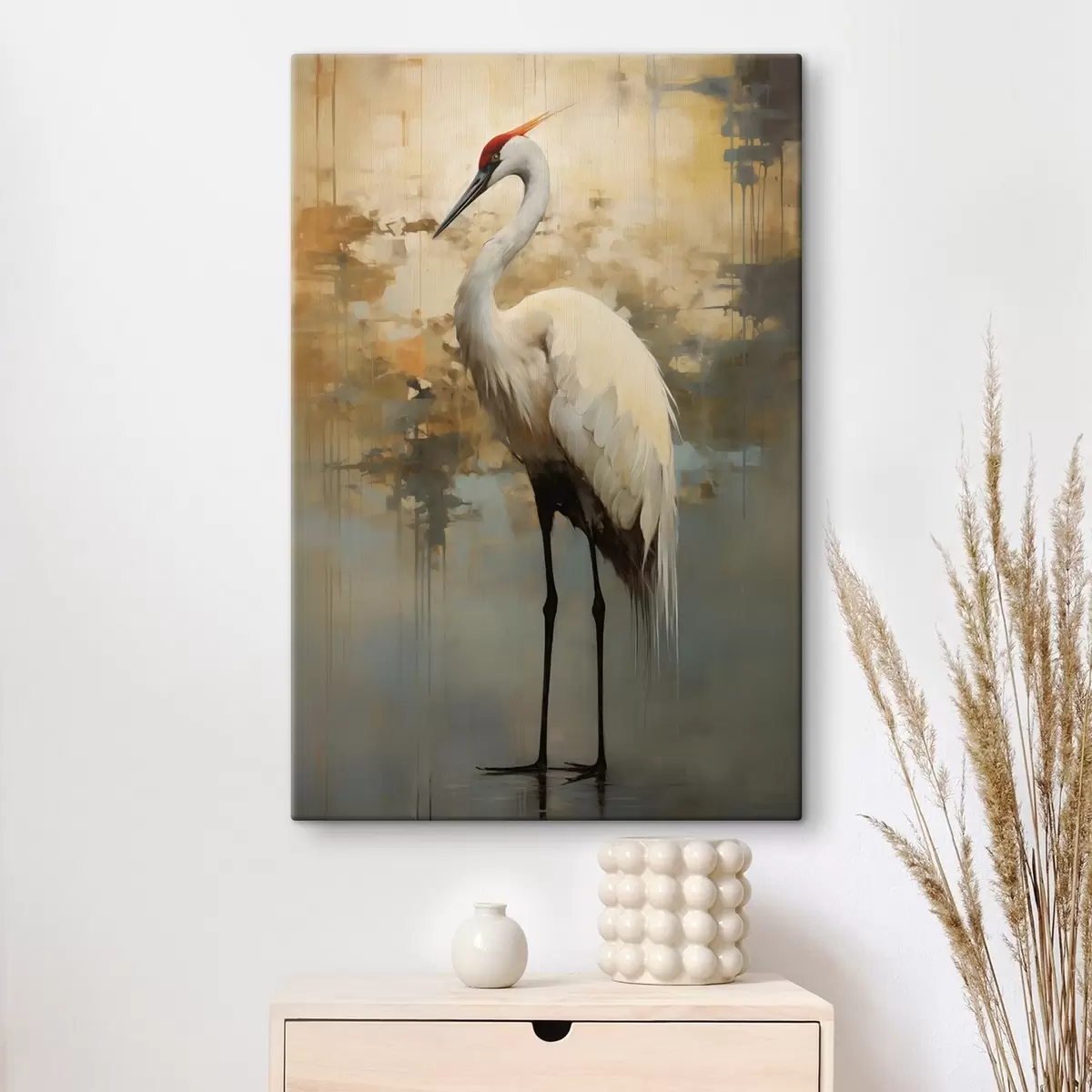 Obraz Bílá volavka na pozadí tlumených žlutých, hnědých a modrých odstínů naznačujících mlhavou abstraktní krajinu Č. s45192