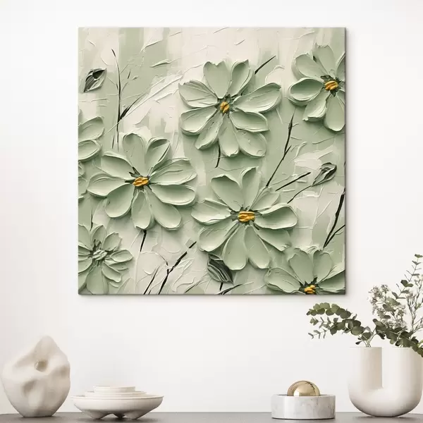 Obraz Zelené květy se žlutými středy malované hustými tahy štětce na světlém pozadí Č. s45265