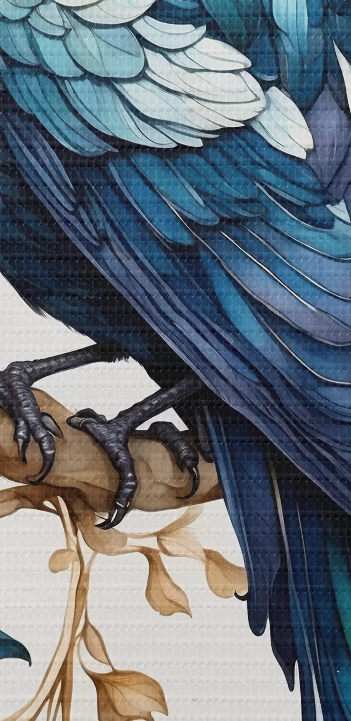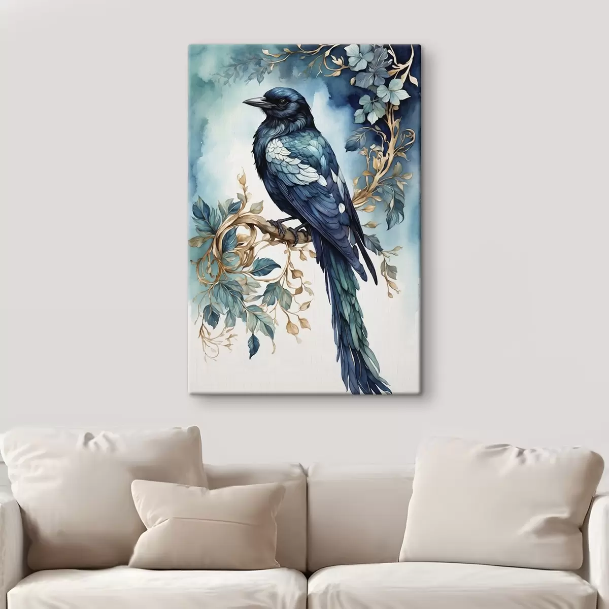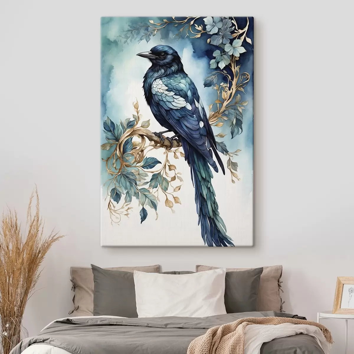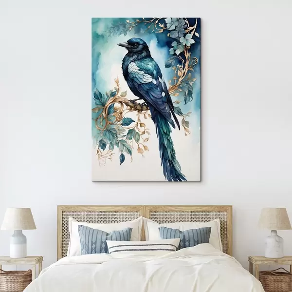 Obraz Modrý pták na větvi s akvarelovými listy Č. s45483