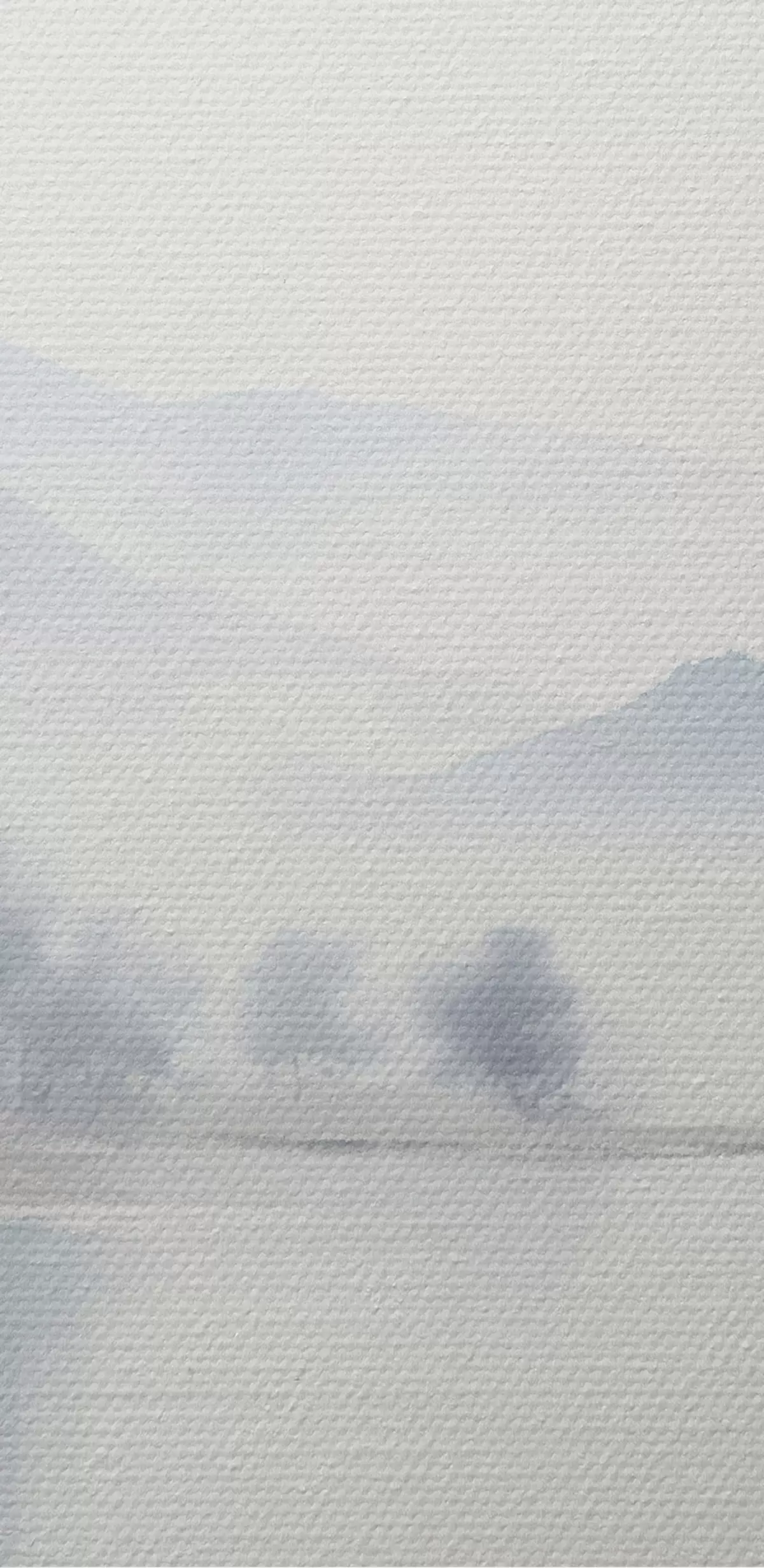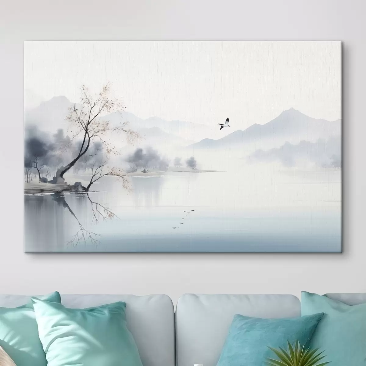 Obraz Mlžná krajina se stromem, horami a ptáky Č. s45518
