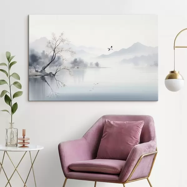 Obraz Mlžná krajina se stromem, horami a ptáky Č. s45518