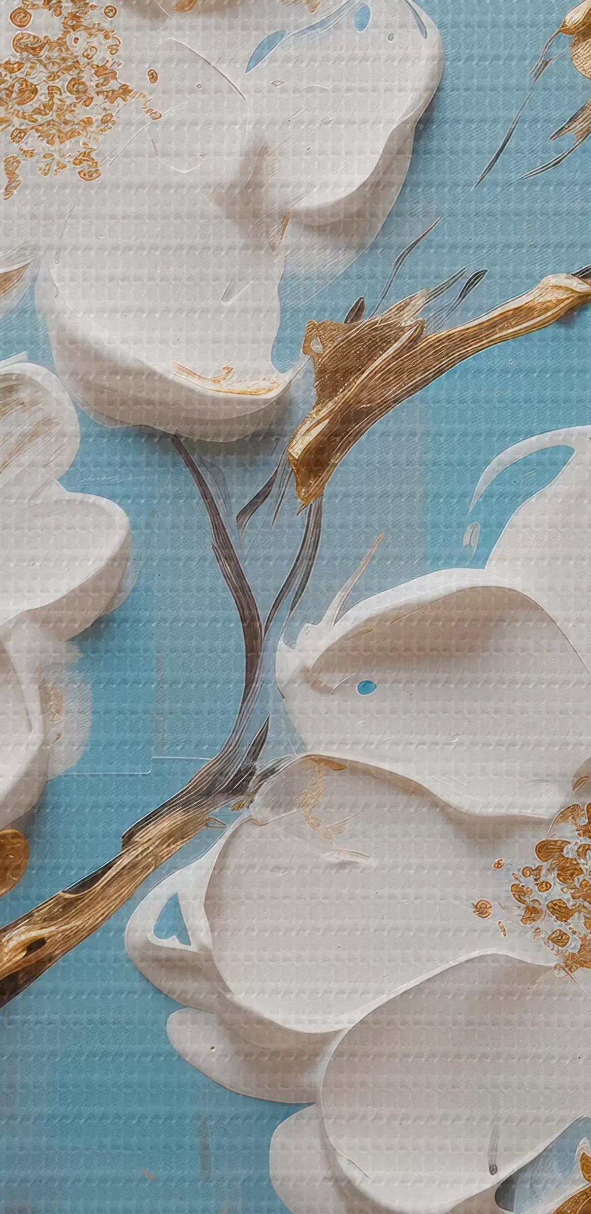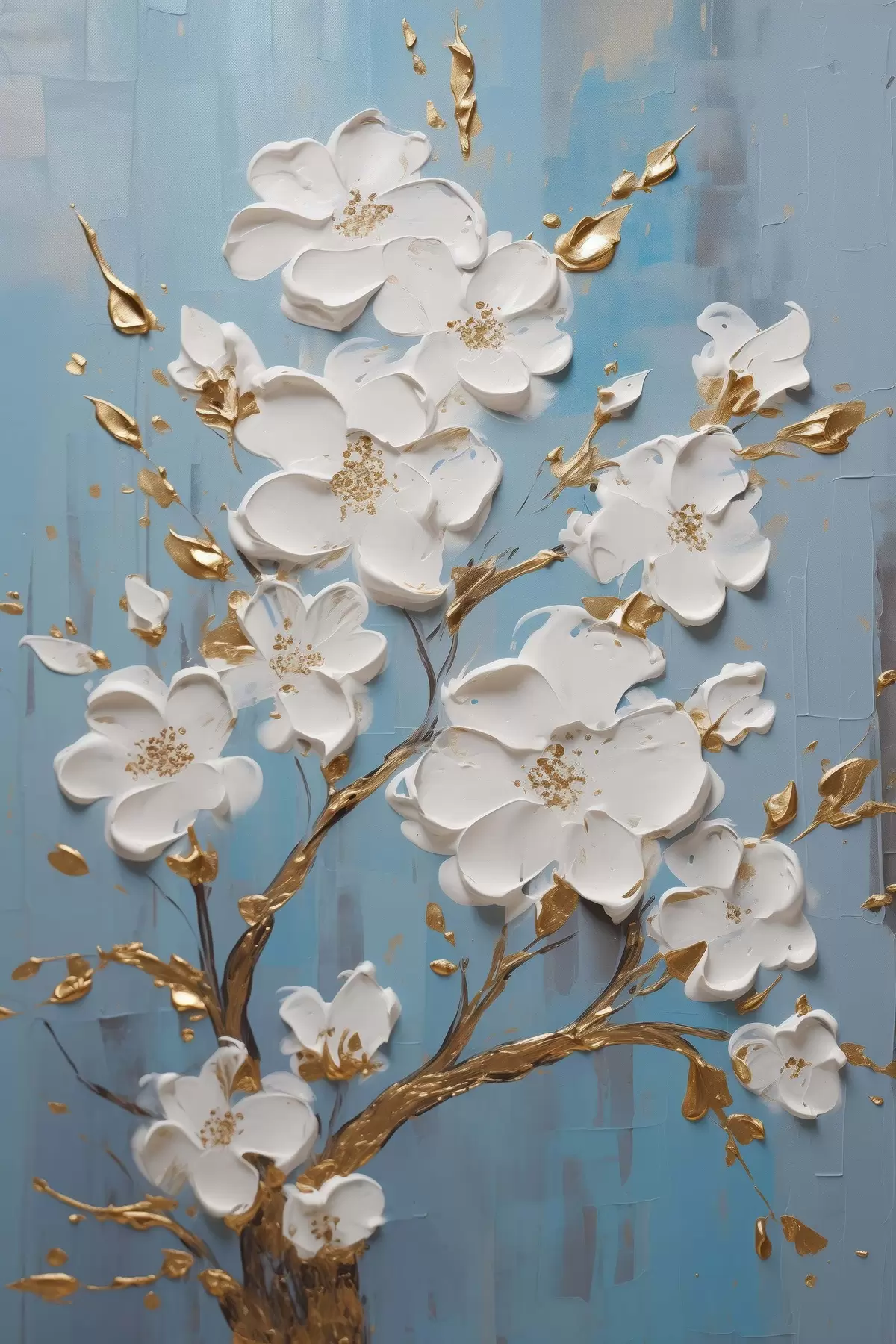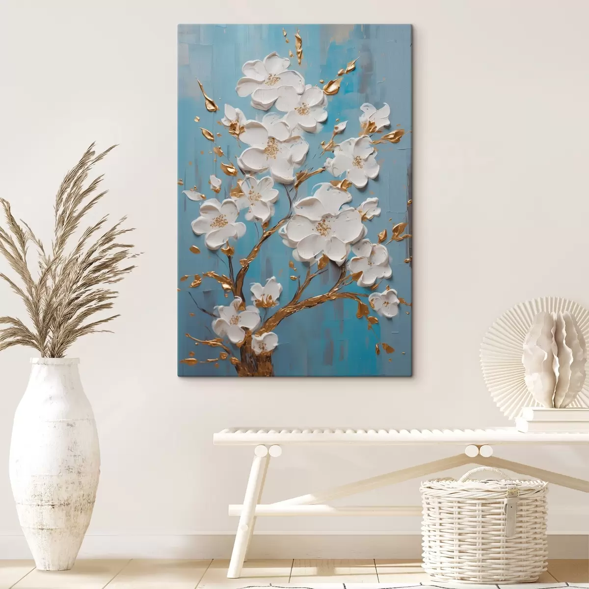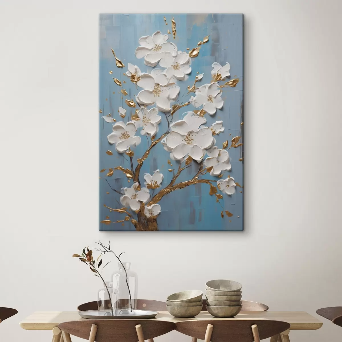 Obraz Bílé květy na větvi: dekorativní motiv ve světle modrých tónech Č. s45541
