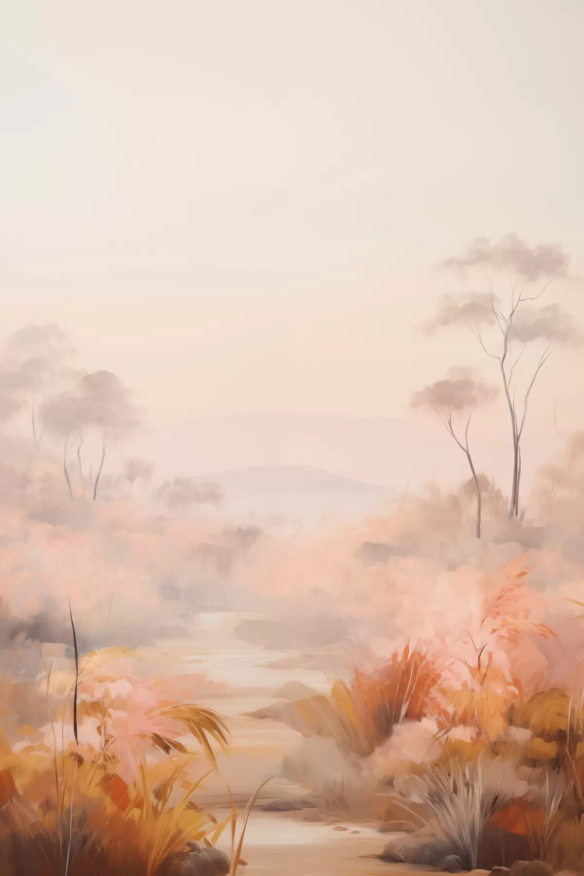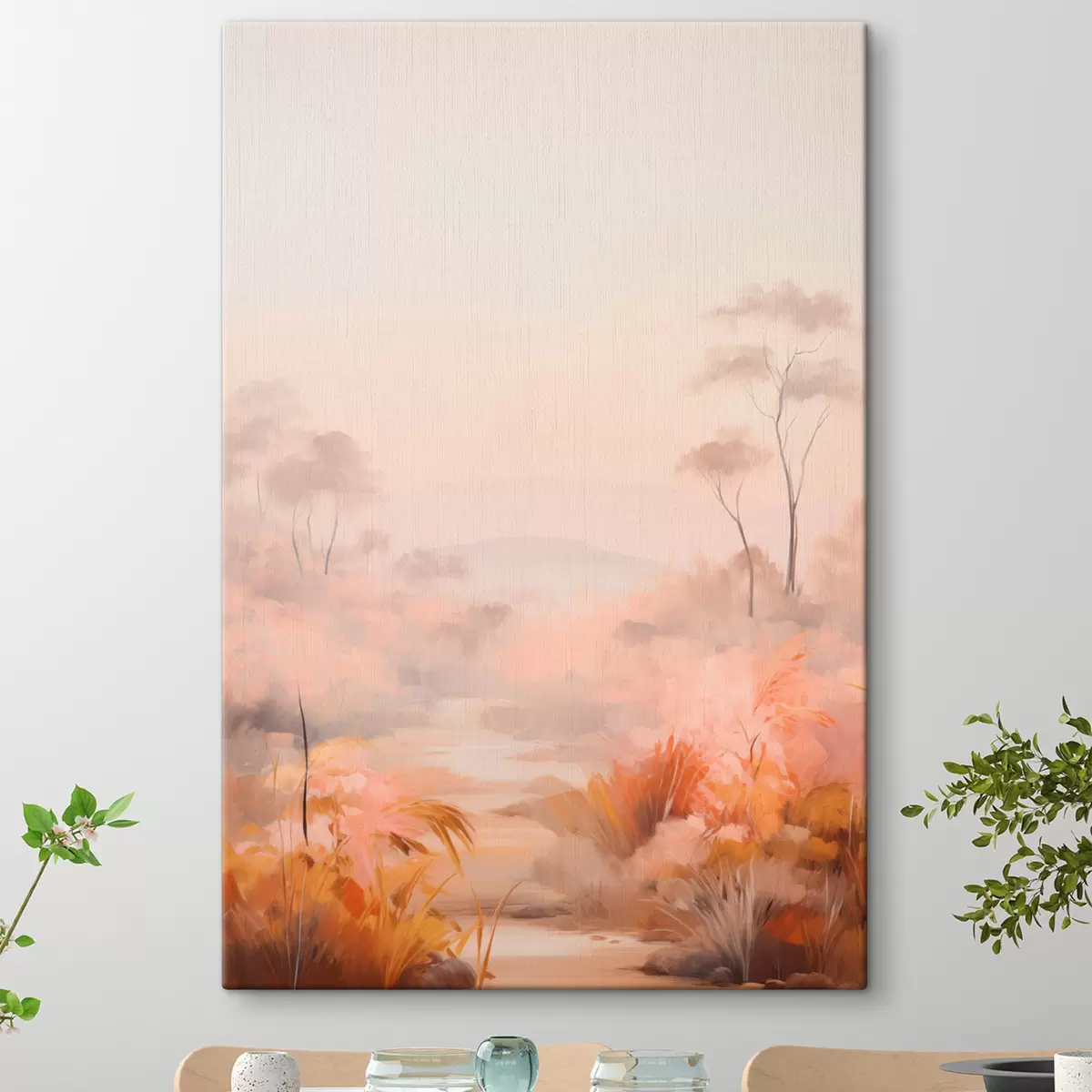 Obraz Krajina s keři a stromy v odstínech růžové, oranžové a hnědé barvy s horami v pozadí Č. s45553