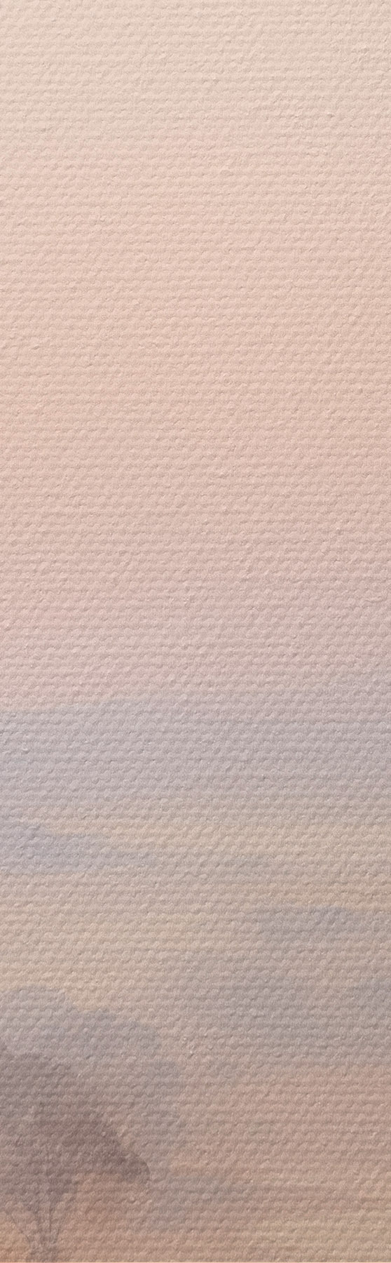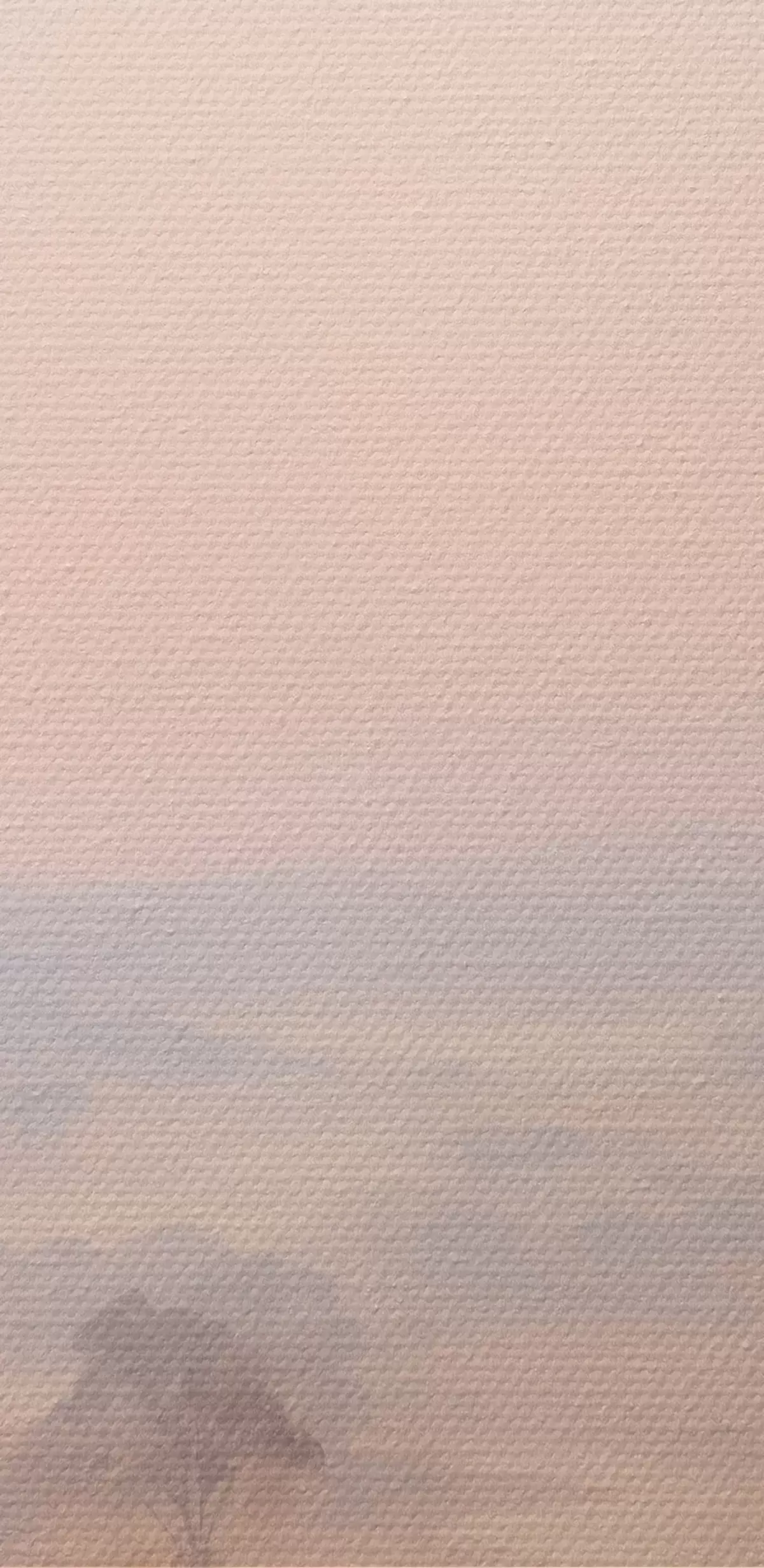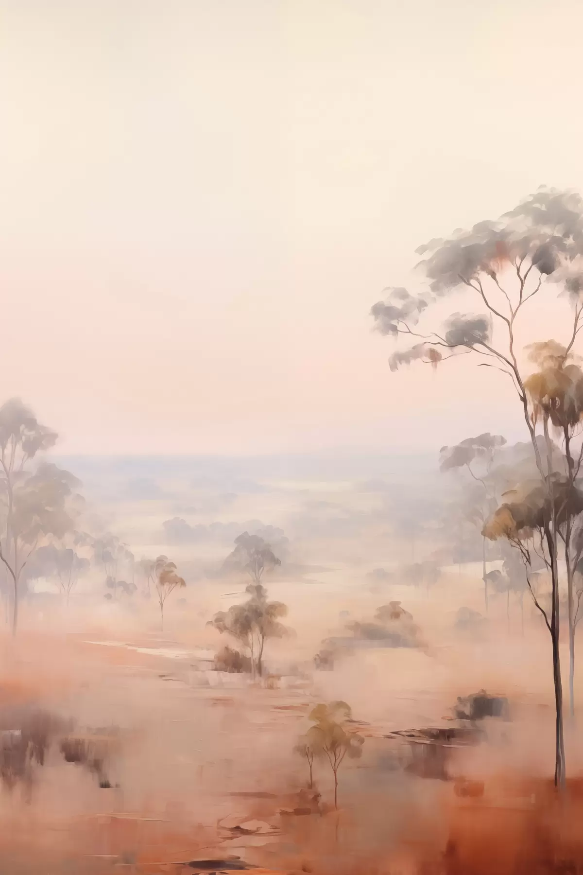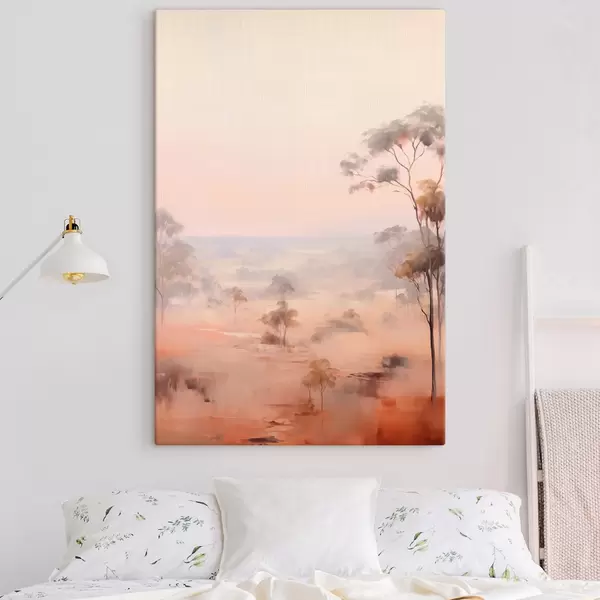 Obraz Krajina s keři a stromy v pastelových odstínech růžové , oranžové a hnědé s horami v pozadí Č. s45554