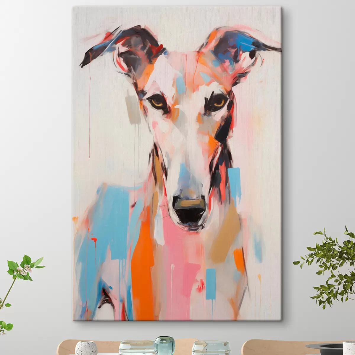 Obraz Chrtí pes namalovaný v zářivých barvách, jako je oranžová, růžová a modrá, na obyčejném bílém pozadí Č. s45565
