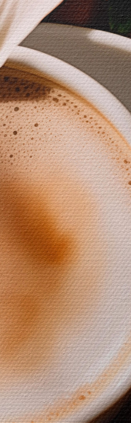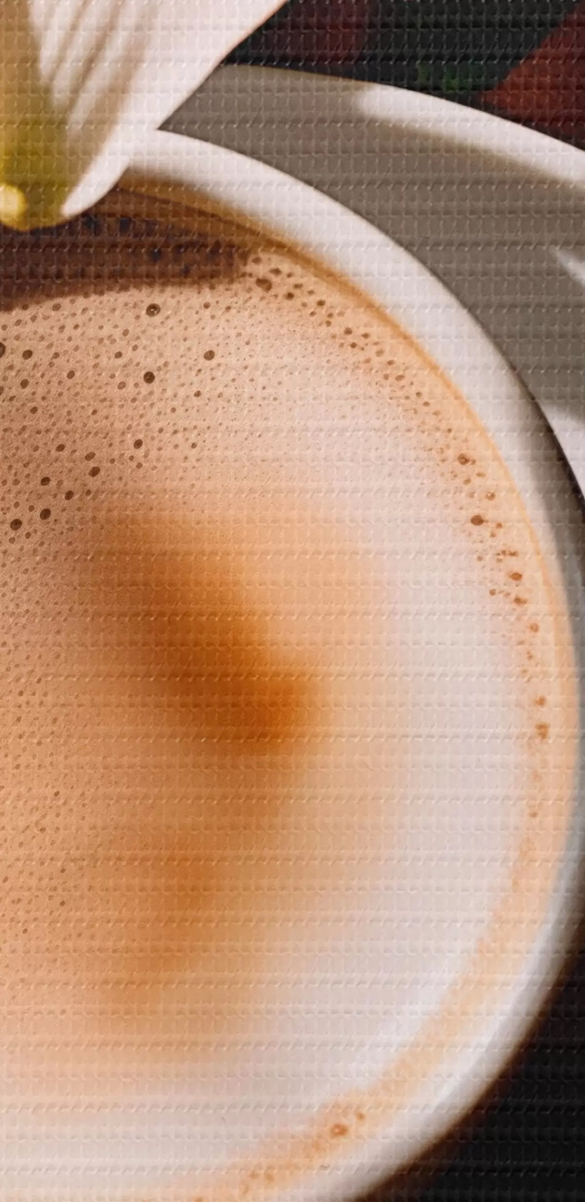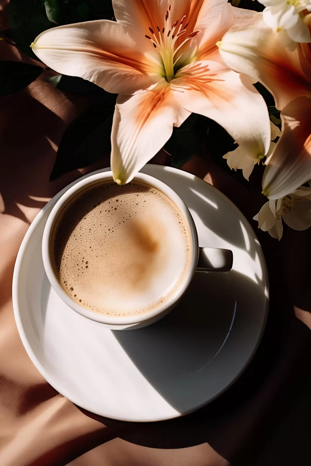 Obraz Šálek kávy s pěnou na bílém talíři, květiny v pozadí, sluneční světlo Č. s45569