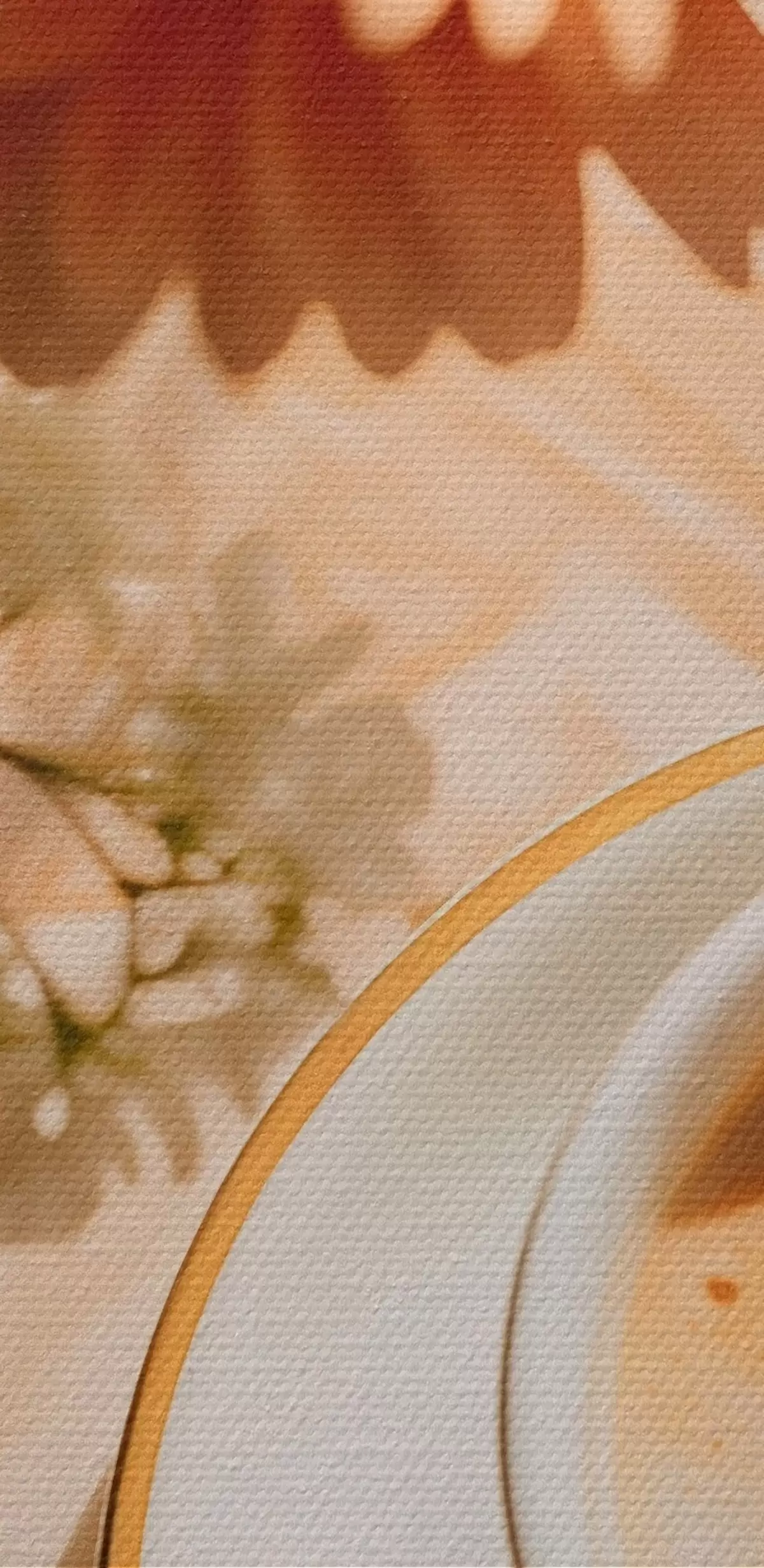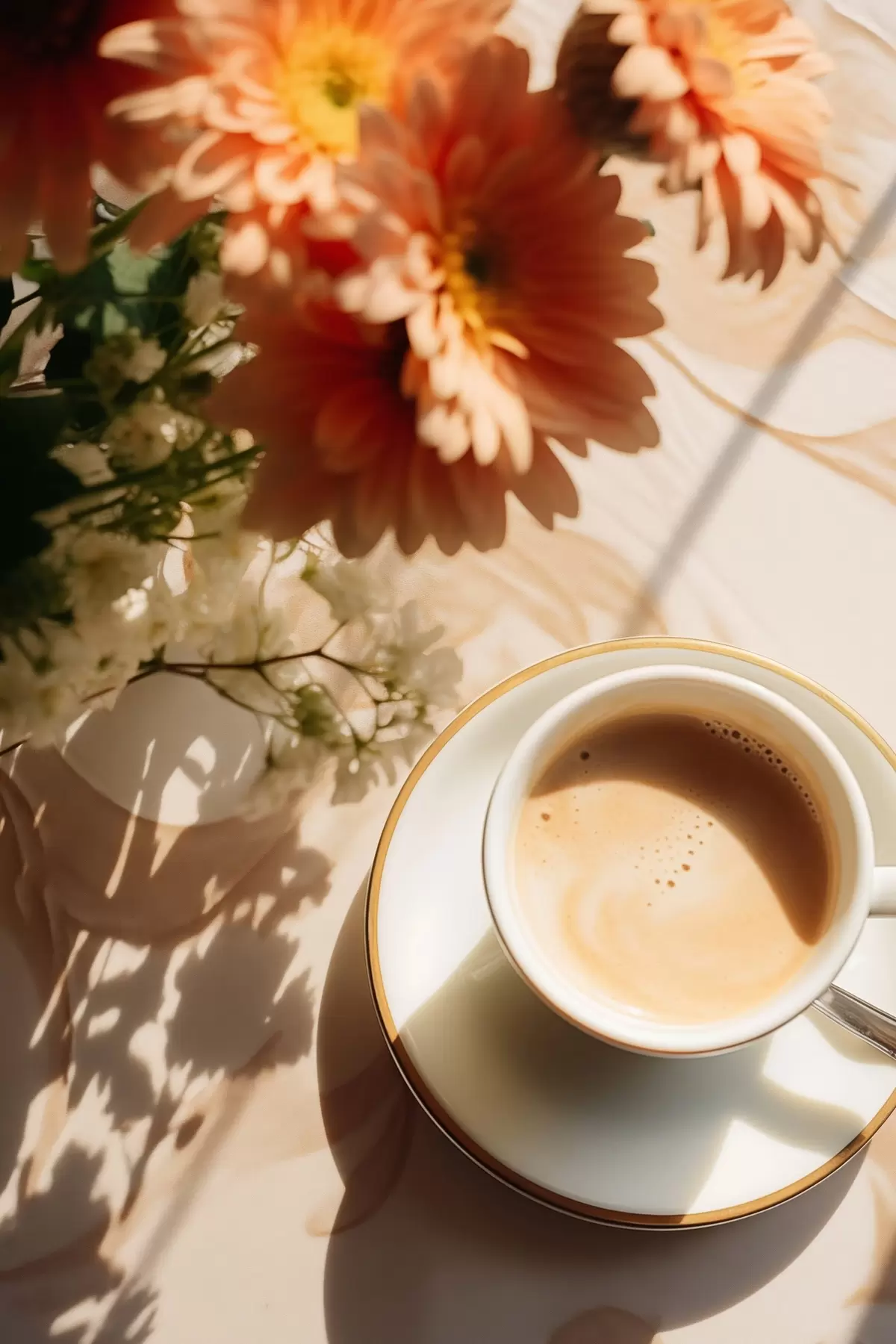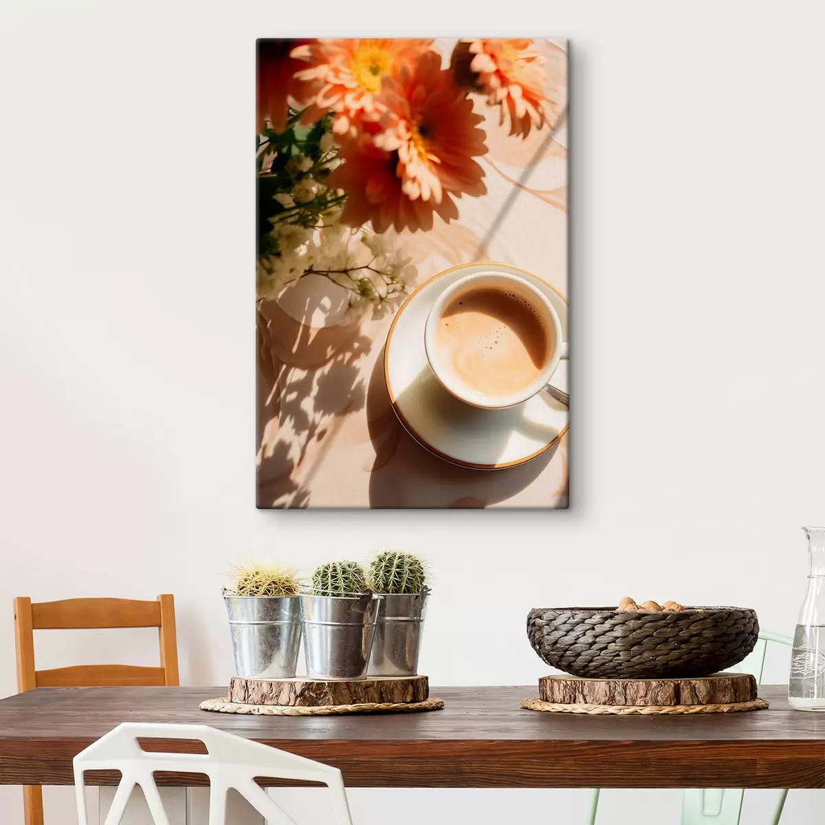 Obraz Šálek kávy s pěnou na bílém talíři, květiny v pozadí, sluneční světlo Č. s45570