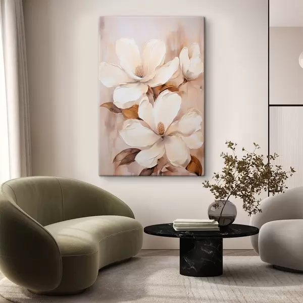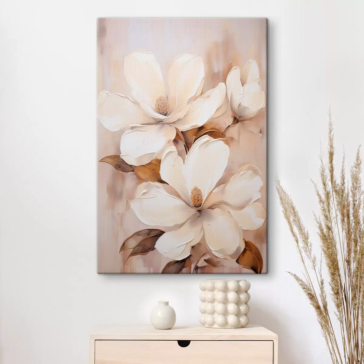 Obraz Bílé květy magnólie na měkkém, rozmazaném pozadí v béžových a hnědých tónech, styl malby Č. s45572