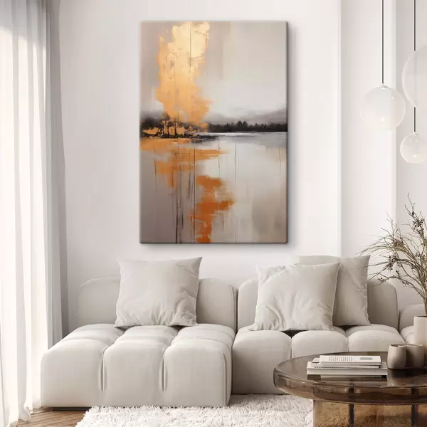 Obraz Abstraktní krajina s jezerem, stromem a žlutou mlhou , ve které se odráží voda a zatažená obloha Č. s45575