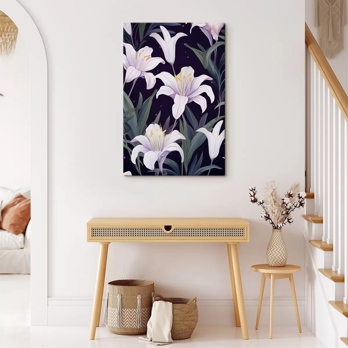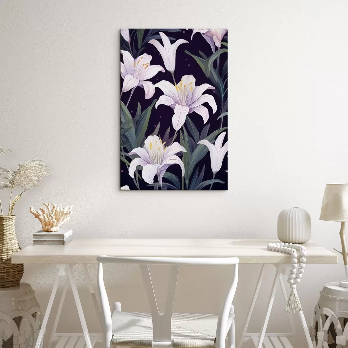 Obraz Jemné lilie na tmavém pozadí se zelenými listy Č. s45697