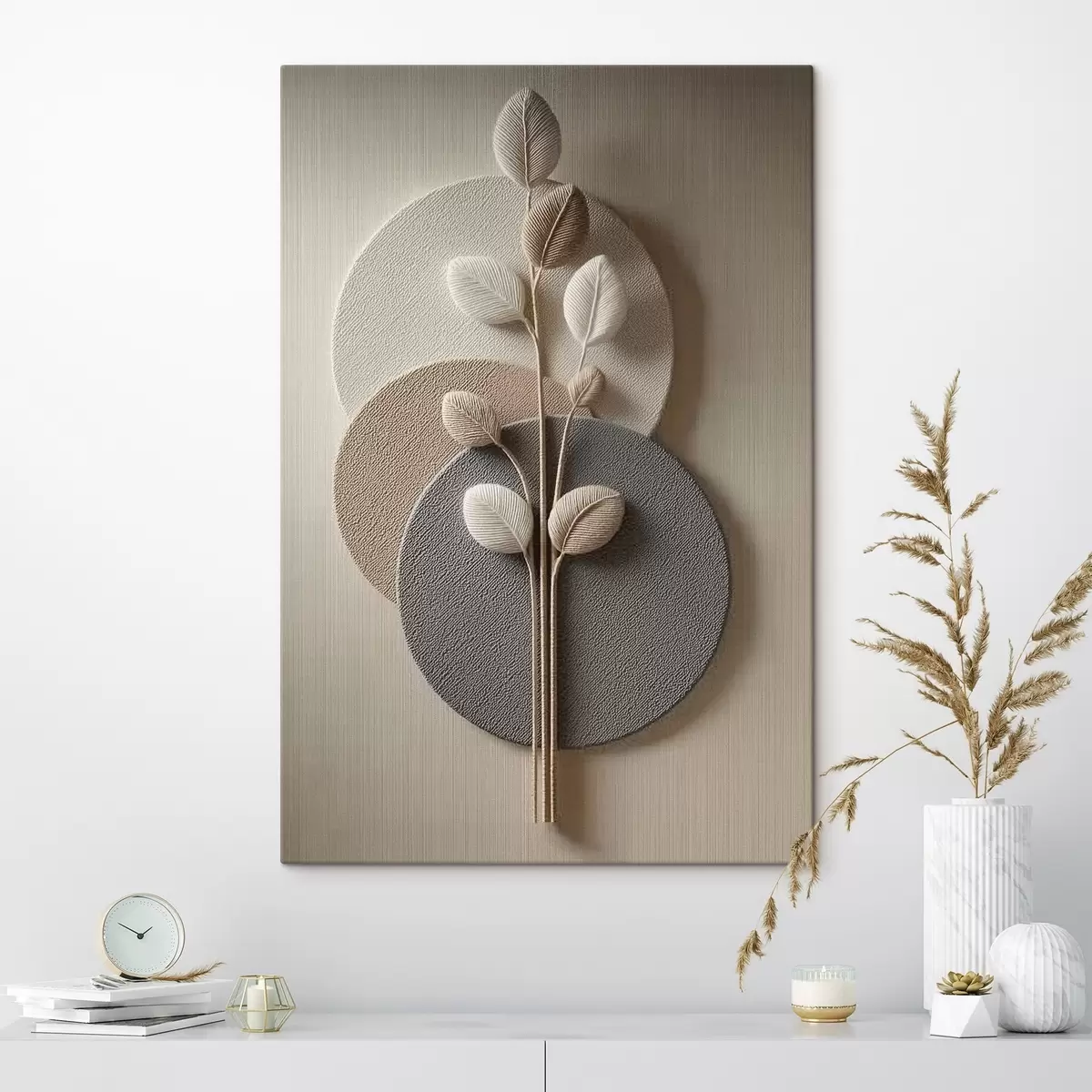 Obraz Reliefní kruhy a větev v teplých neutrálních tónech Č. s45883