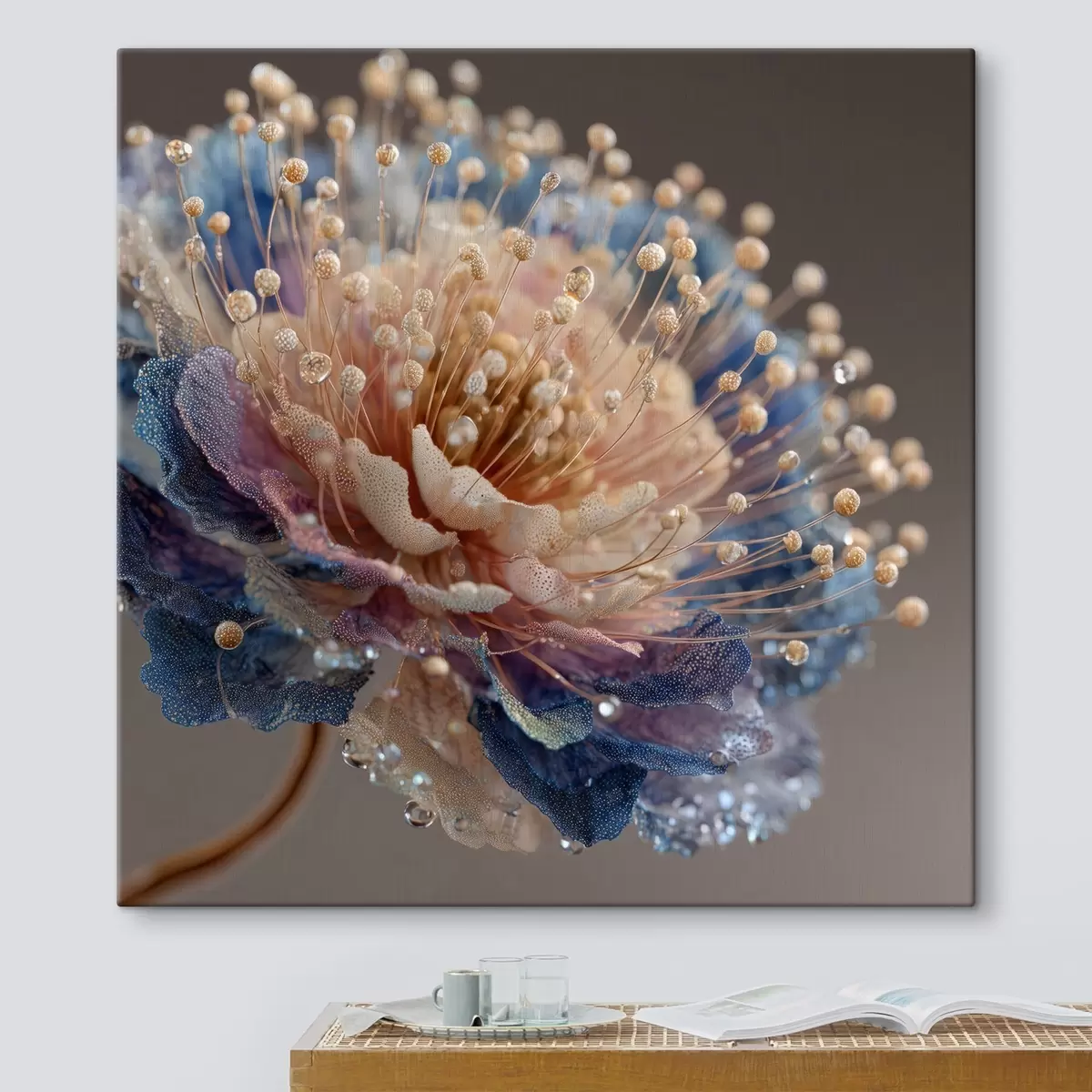 Obraz Perleťový květ s kapkami rosy, broskvově modré okvětní lístky Č. s45911