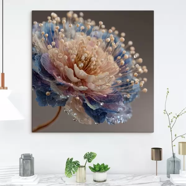 Obraz Perleťový květ s kapkami rosy, broskvově modré okvětní lístky Č. s45911