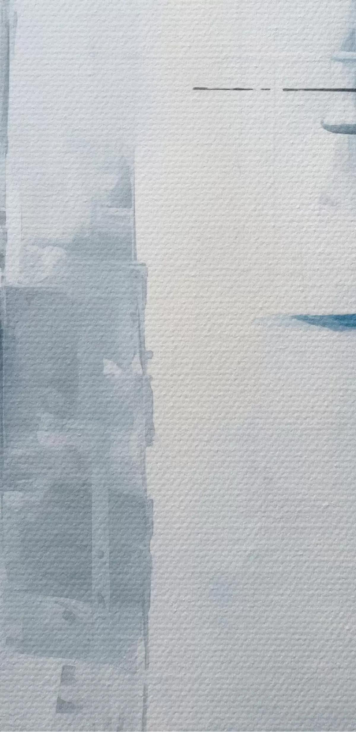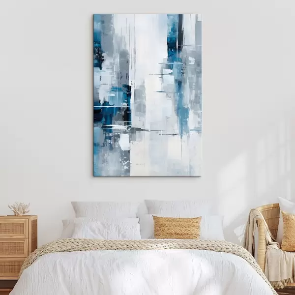 Obraz Abstraktní malba imitující modrou, šedou a bílou barvu, svislé čáry a geometrické tvary Č. s45926