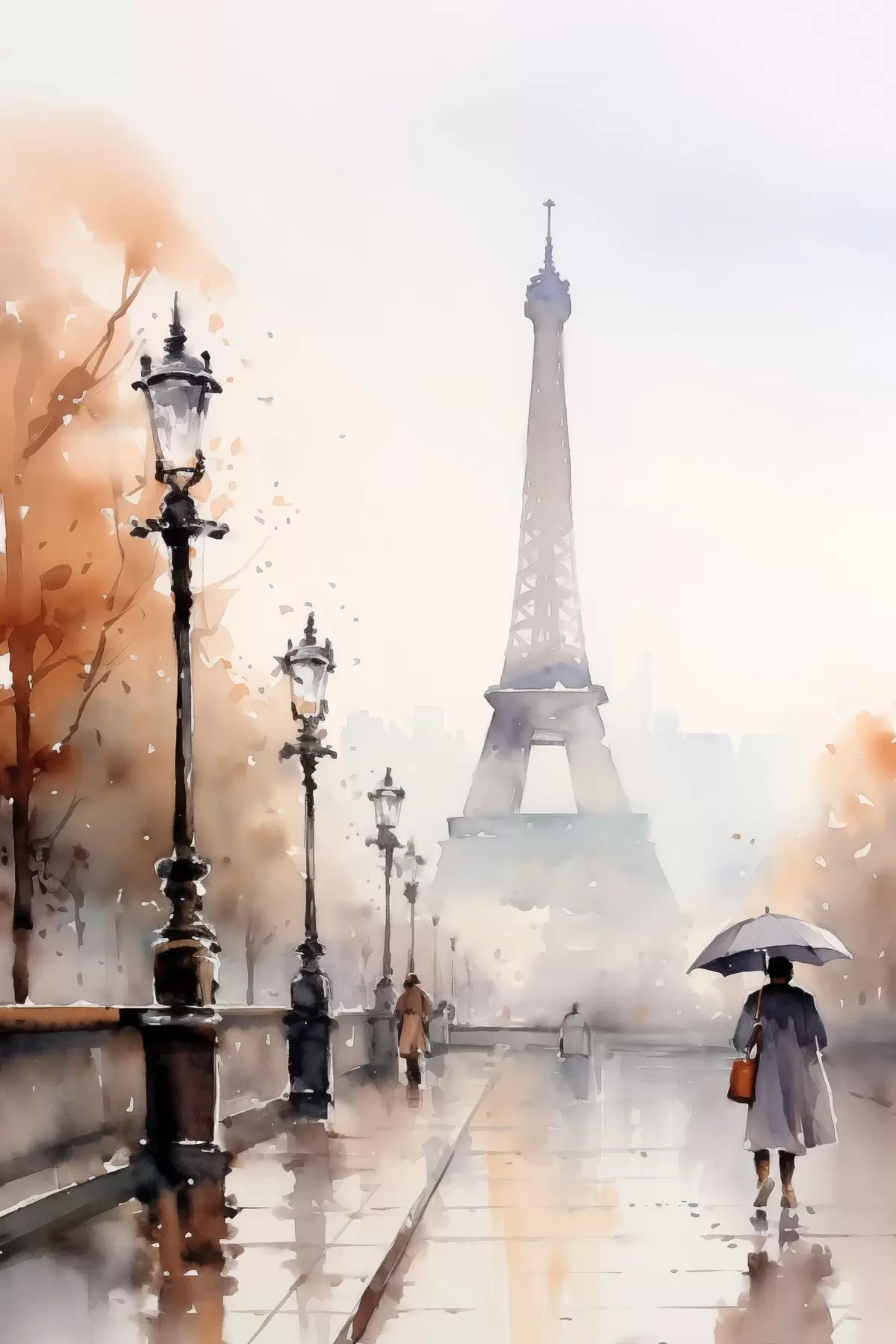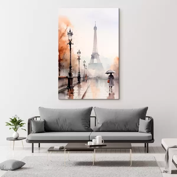 Obraz Deštivý den v Paříži s Eiffelovou věží v pozadí a vintage pouličními lampami Č. s45930