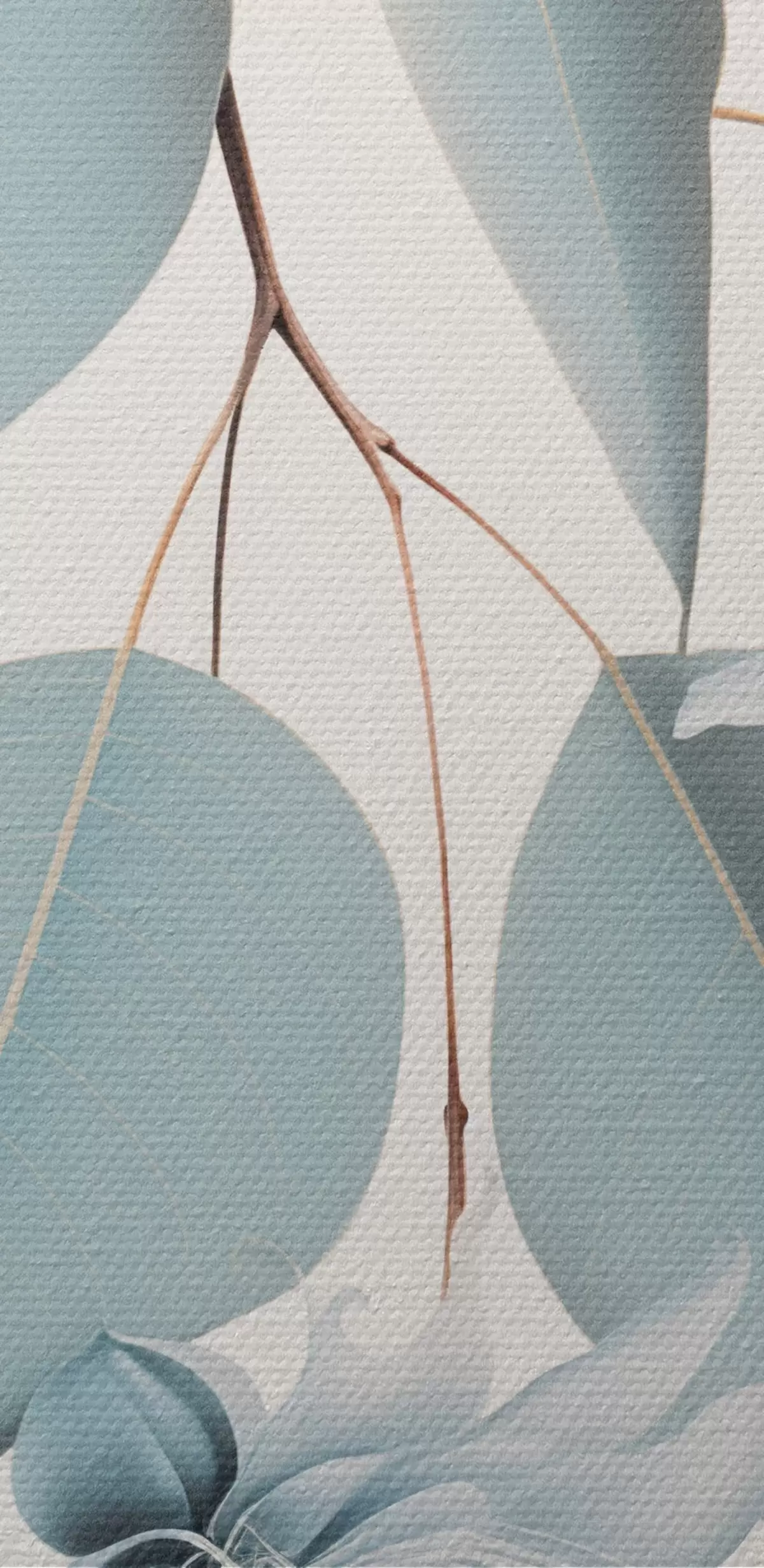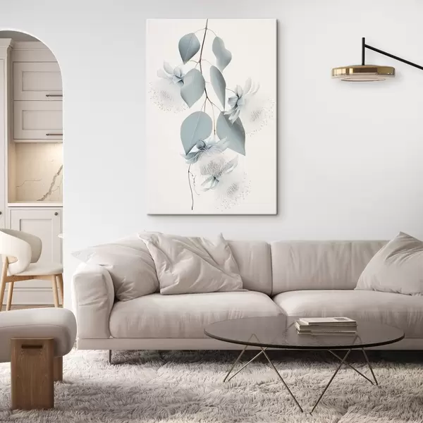 Obraz Eukalyptová větev s modrými listy a bílými květy, světlé pozadí Č. s45947