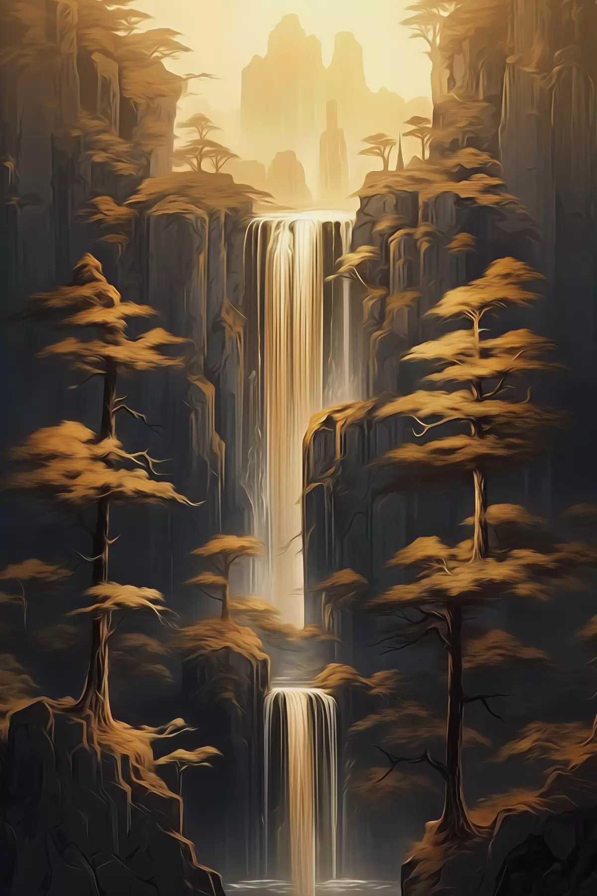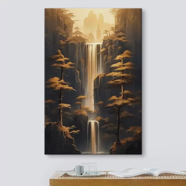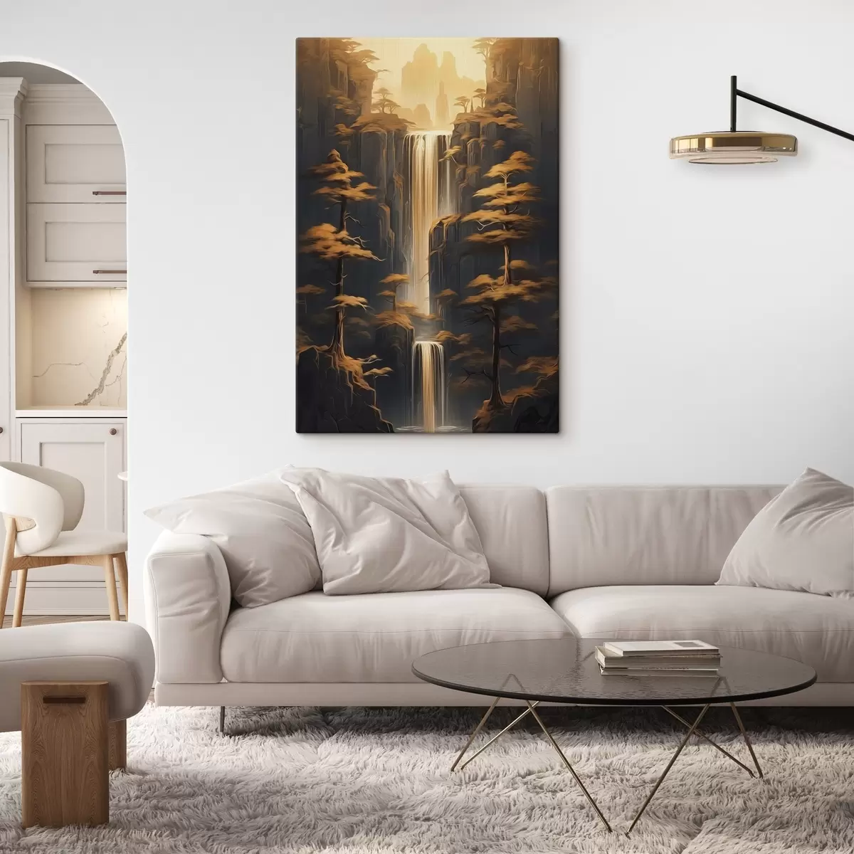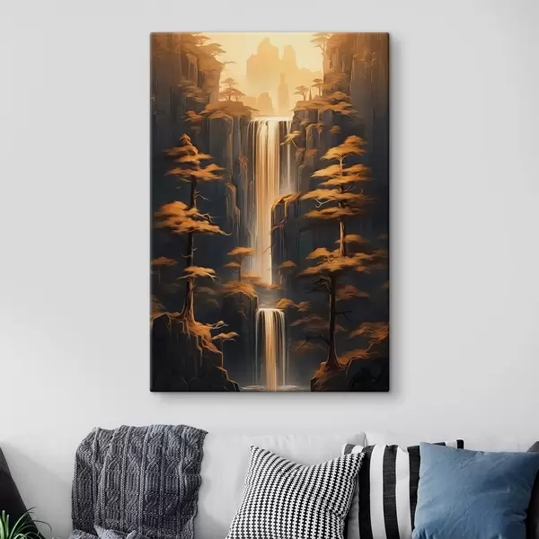 Obraz Vysoké útesy s vodopádem a borovicemi ve večerním světle Č. s46151