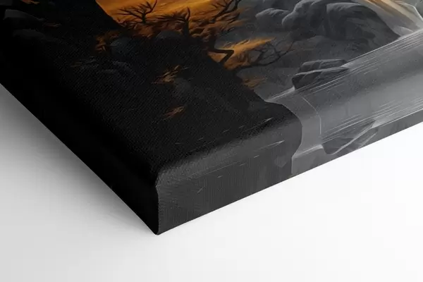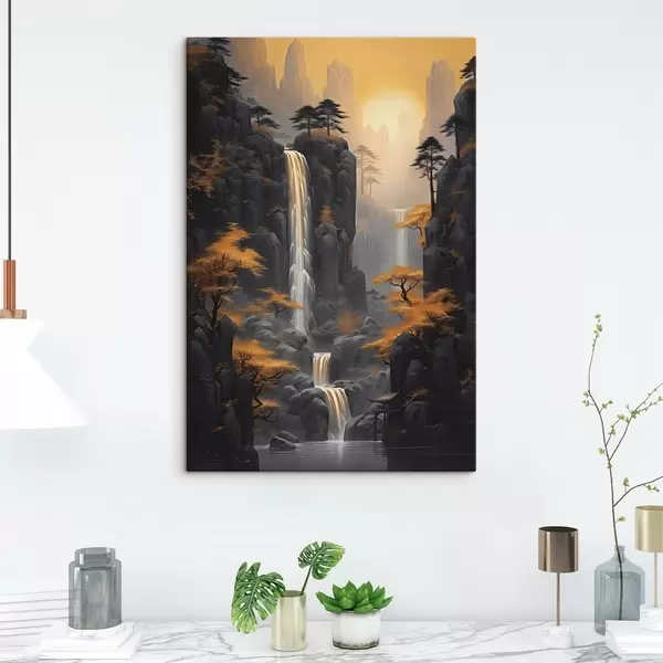 Obraz Skalnatá krajina s vodopádem v teplých barvách západu slunce Č. s46177