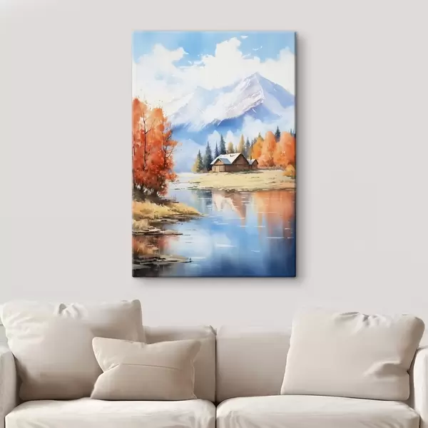Obraz Podzimní krajina u jezera s domem a horami Č. s46184