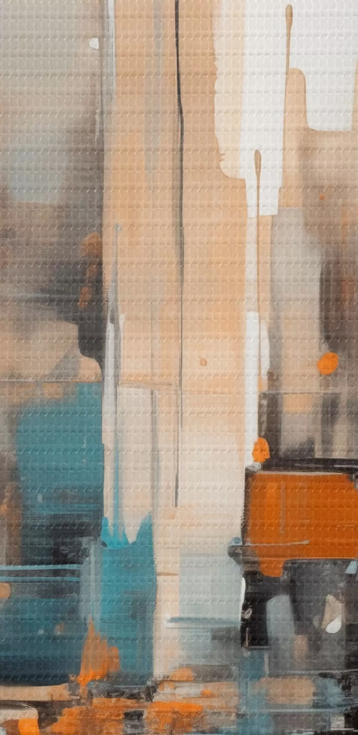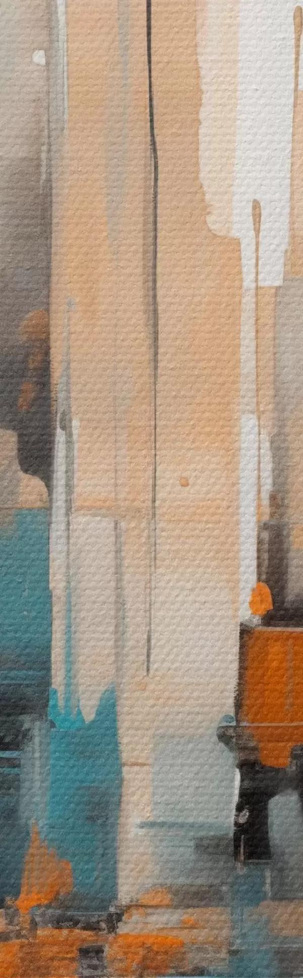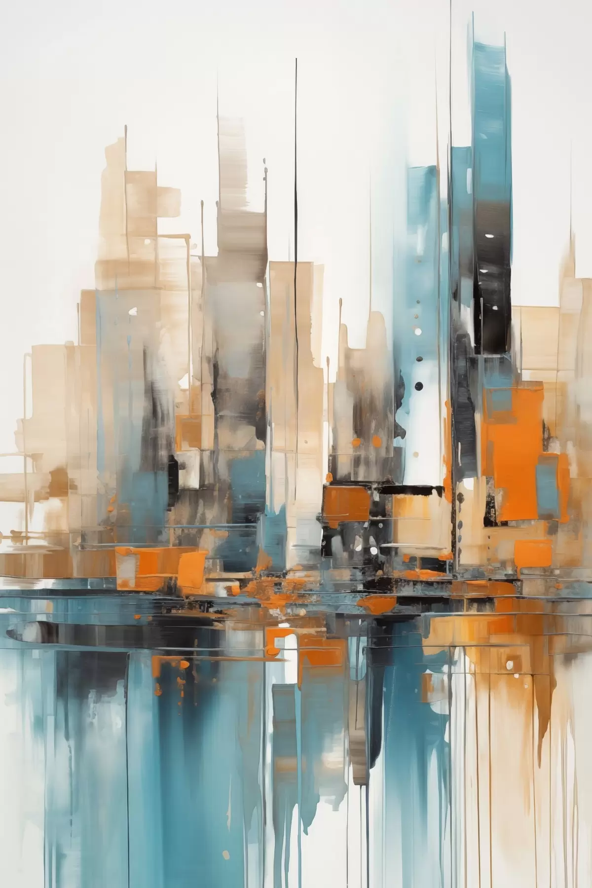 Obraz Abstraktní městská krajina s oranžovými, tyrkysovými a hnědými vertikálními tahy štětcem a geometrickými tvary Č. s46266