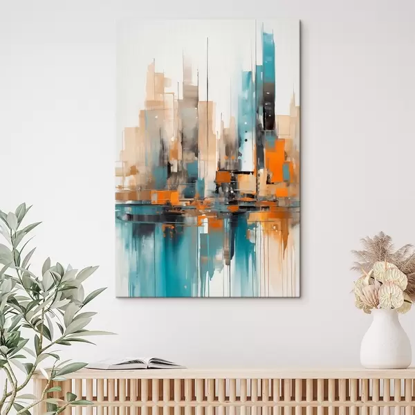 Obraz Abstraktní městská krajina s oranžovými, tyrkysovými a hnědými vertikálními tahy štětcem a geometrickými tvary Č. s46266