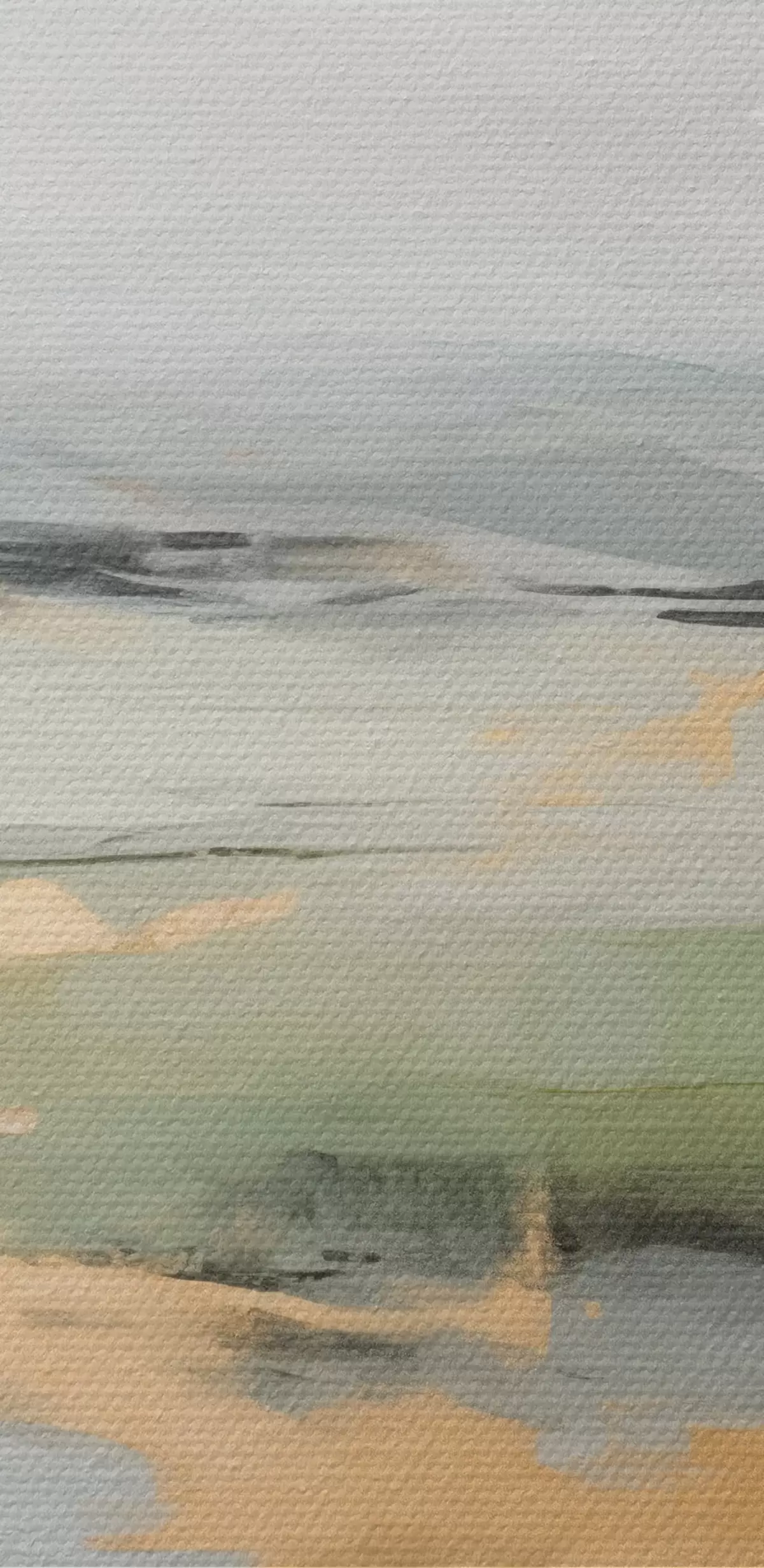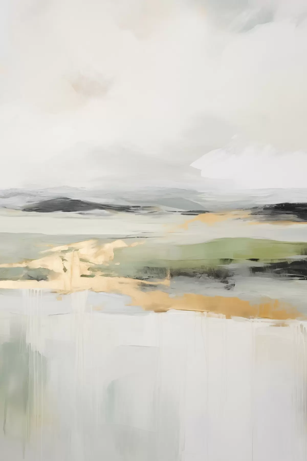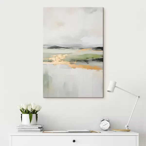 Obraz Abstraktní krajina se žlutými akcenty, minimalistická kompozice země, vody a oblohy, s tlumenými barvami Č. s46269