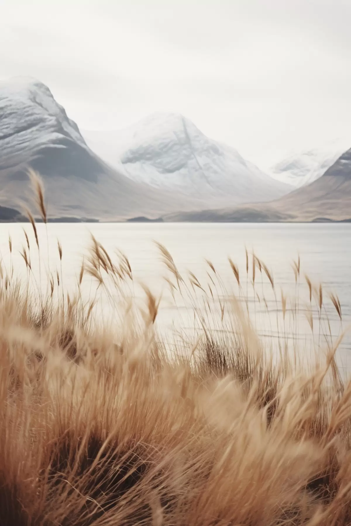 Obraz Pampové trávníky před jezerem s zasněženými horami v pozadí, měkké světlo Č. s46282