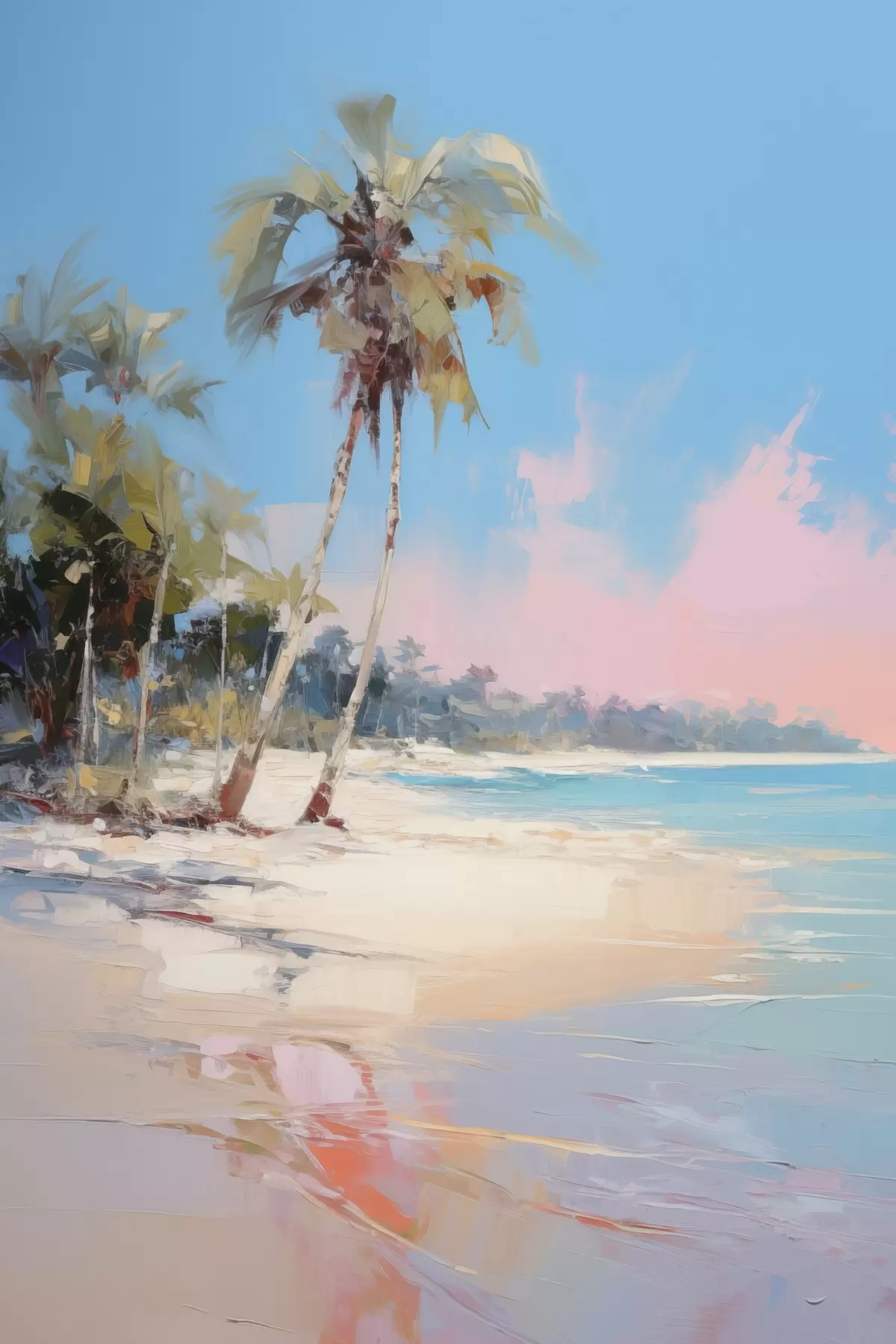 Obraz Abstraktní tropická pláž s bílým pískem a palmami, modrá obloha s bílými mraky Č. s46285