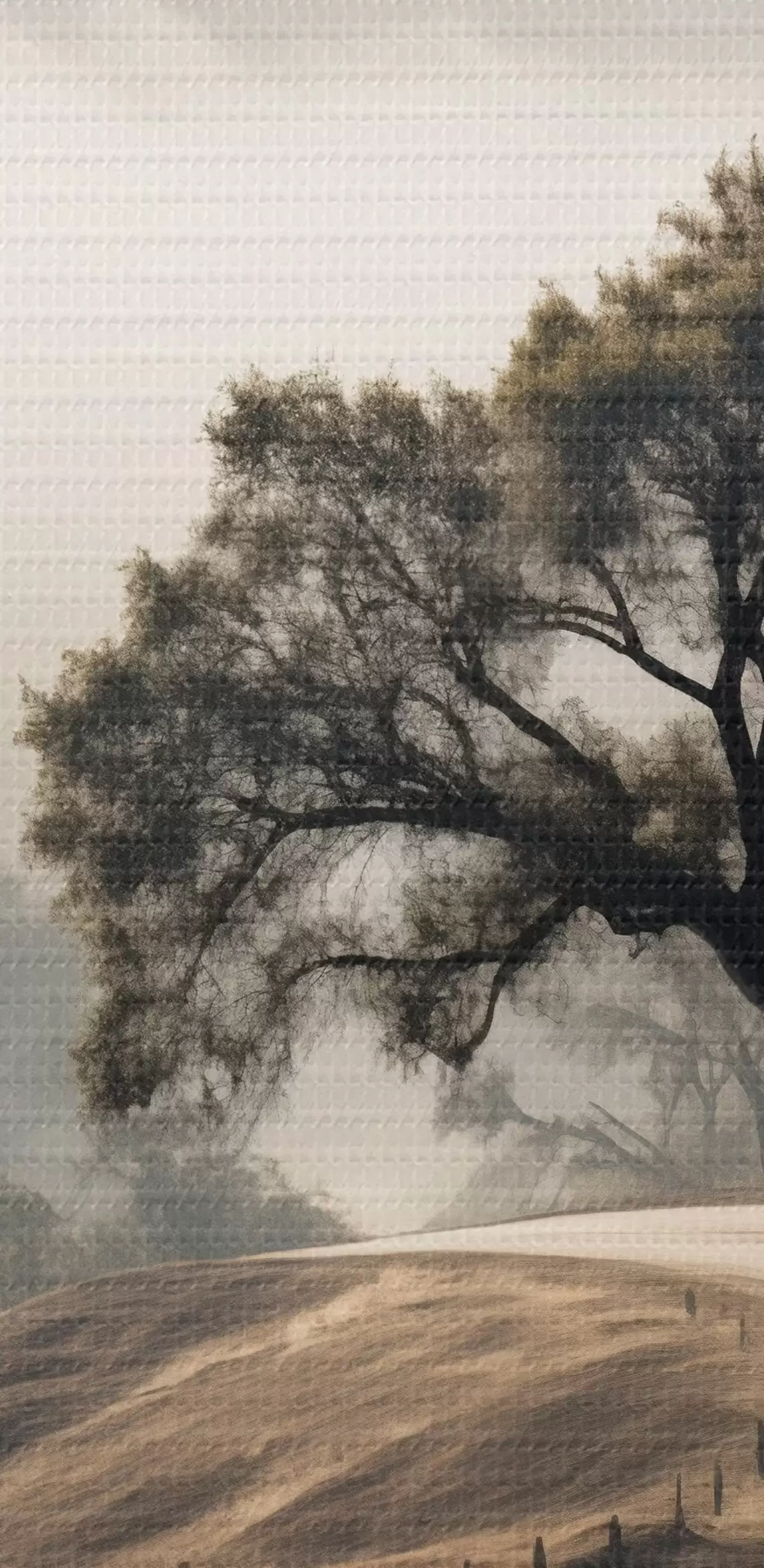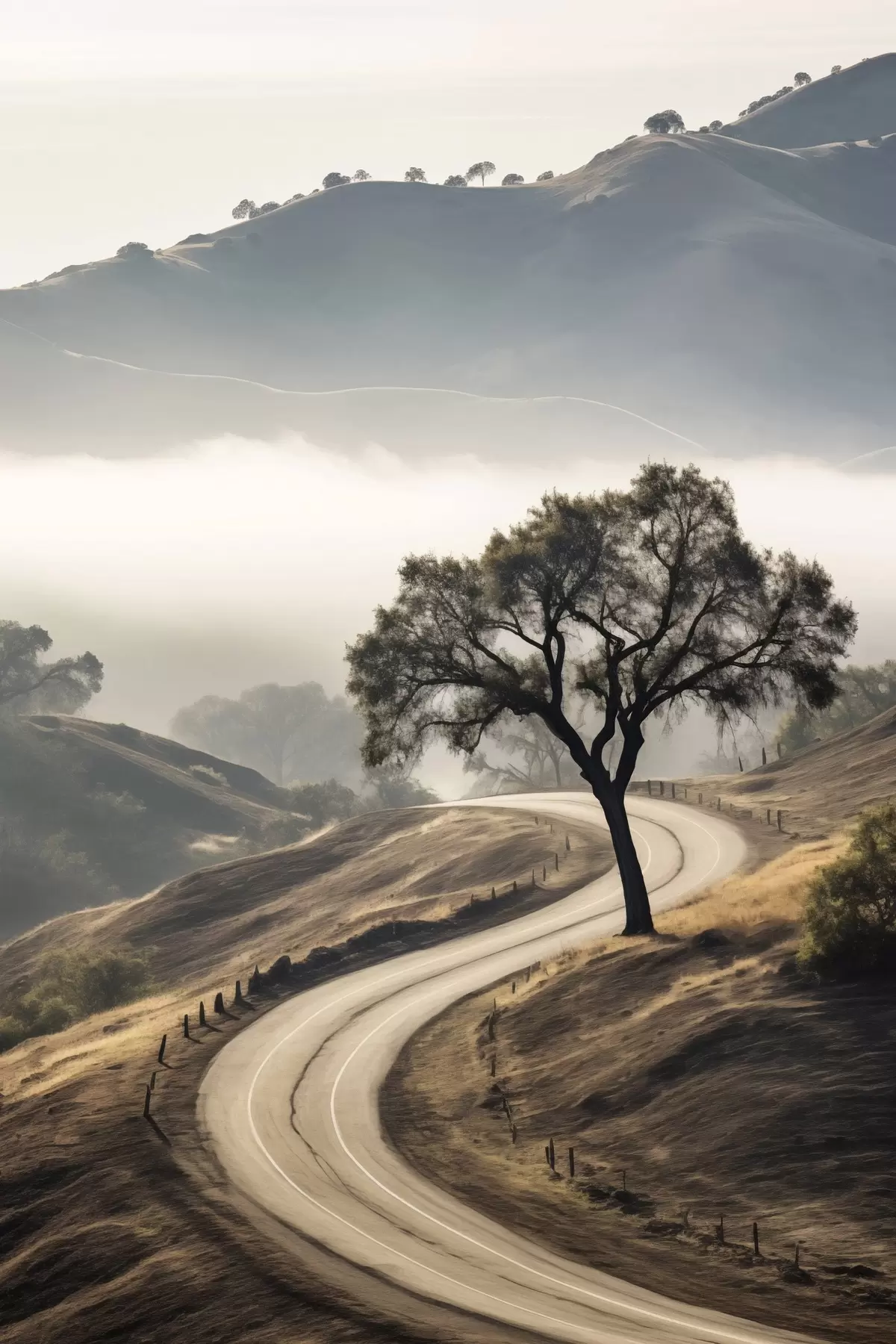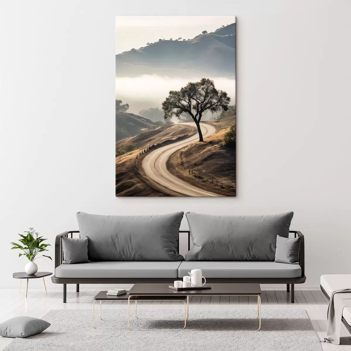 Obraz Klikatá silnice vedoucí přes zvlněné kopce s stromem v popředí, pozadí s mlhou a horami Č. s46288