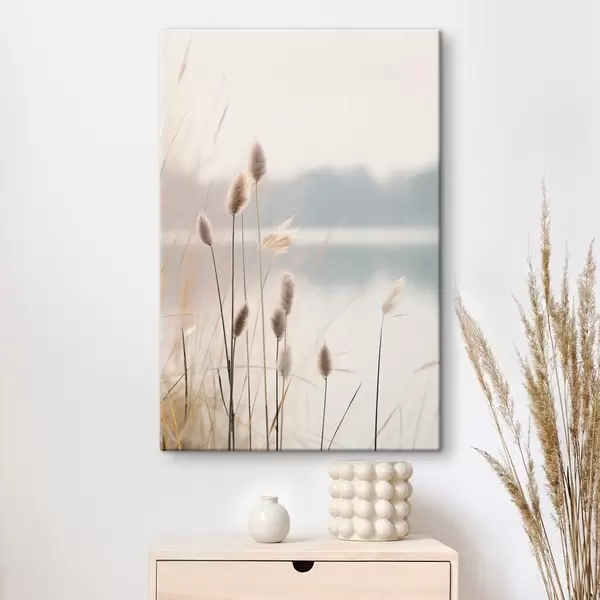 Obraz Měkké rákosí u zamlženého břehu jezera, pastelové béžové tóny Č. s46504