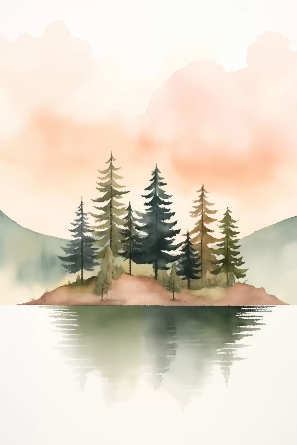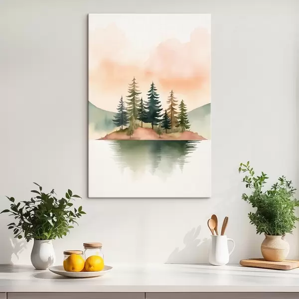 Obraz Akvarelové borovice na zamlženém ostrůvku, jemně broskvová obloha Č. s46505