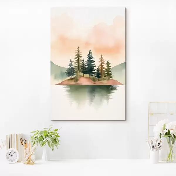 Obraz Akvarelové borovice na zamlženém ostrůvku, jemně broskvová obloha Č. s46505