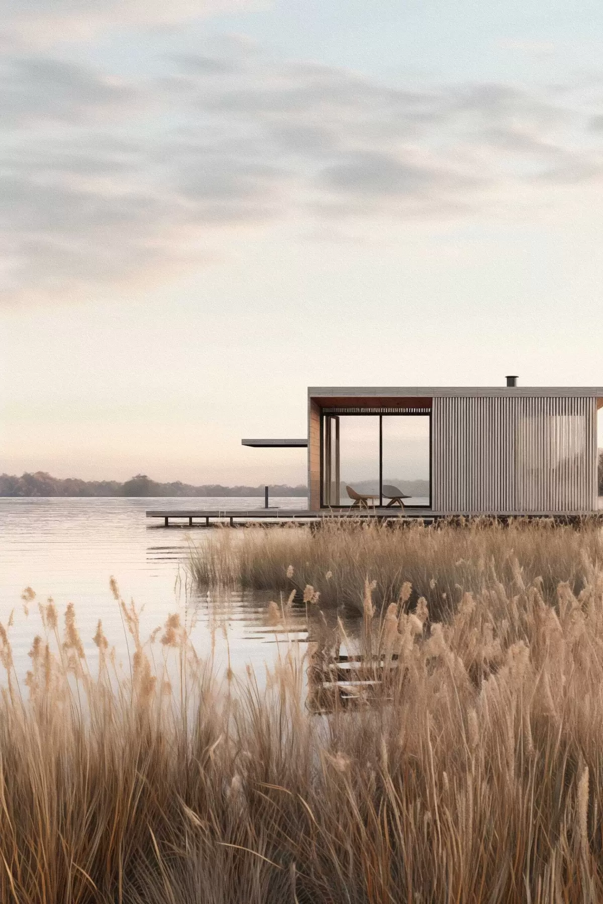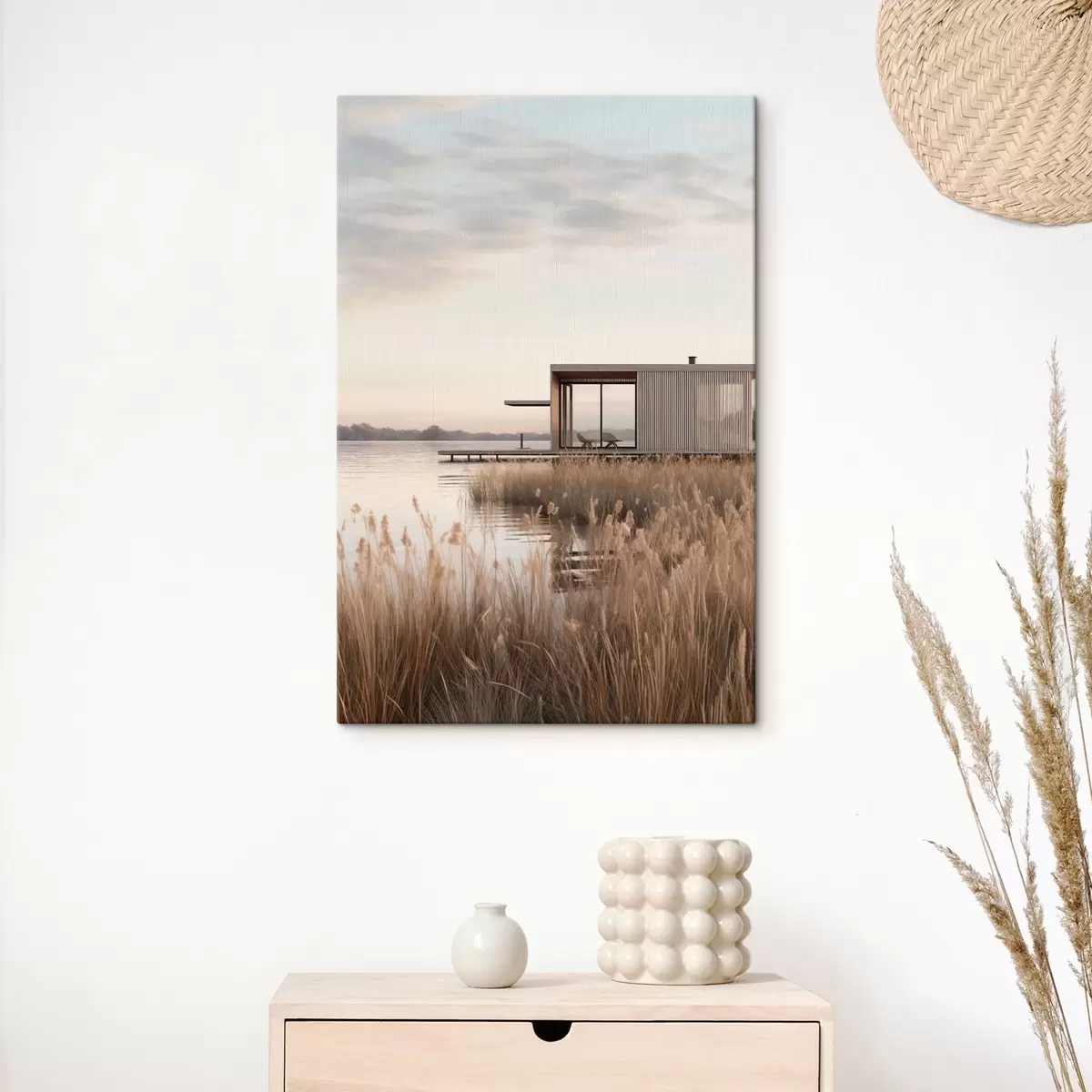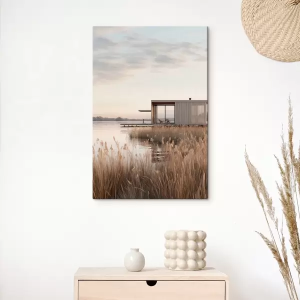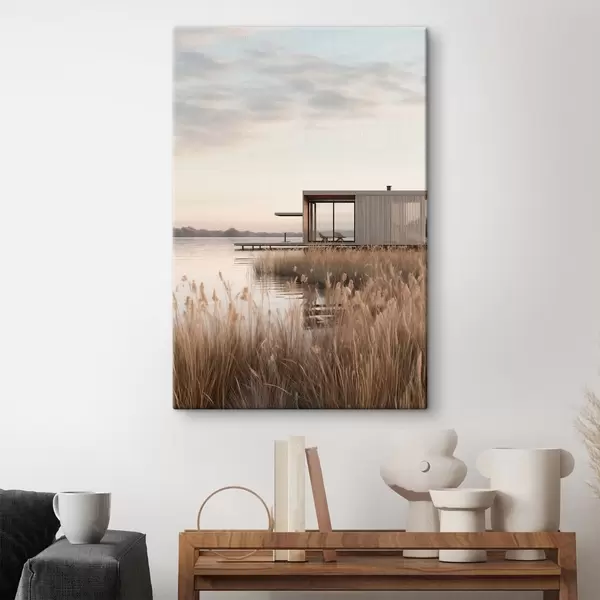 Obraz Moderní chata u jezera mezi rákosím v měkkém soumraku Č. s46513