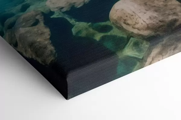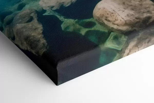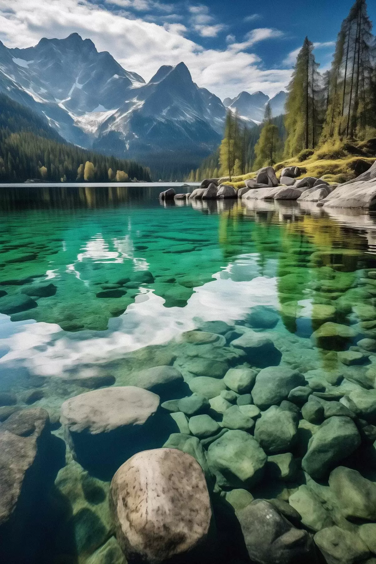 Obraz Smaragdové alpské jezero s kameny pod hladinou a tyčícími se vrcholky hor Č. s46515