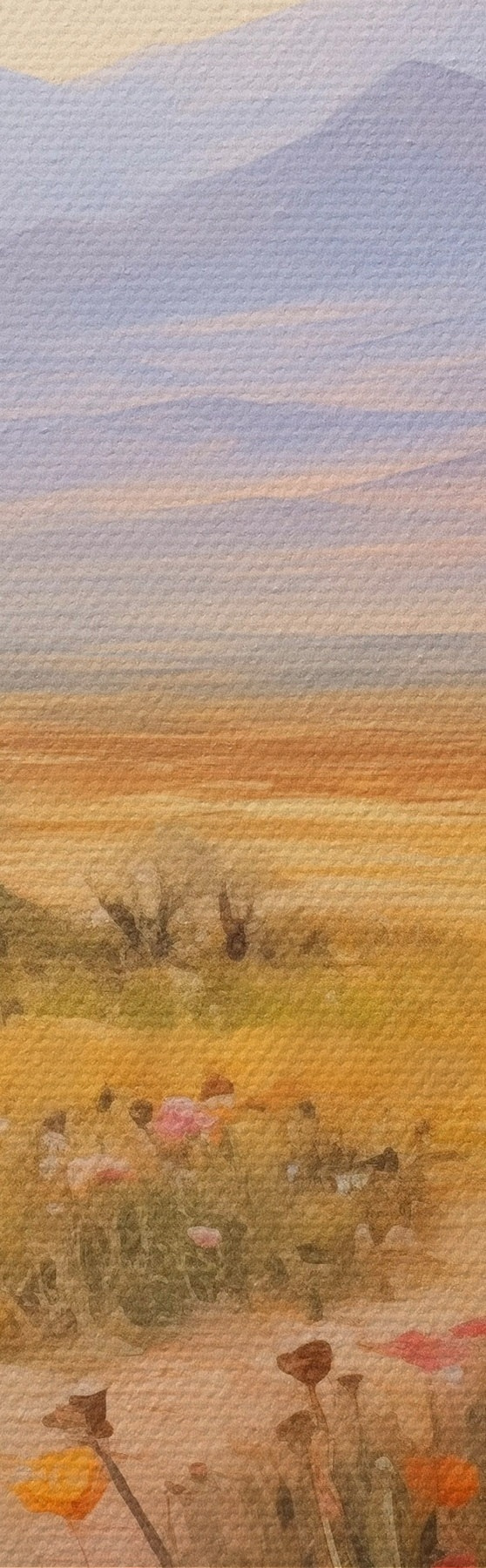 Obraz Krajina, pole barevných květin s horami v pozadí, jemné pastelové barvy Č. s46686