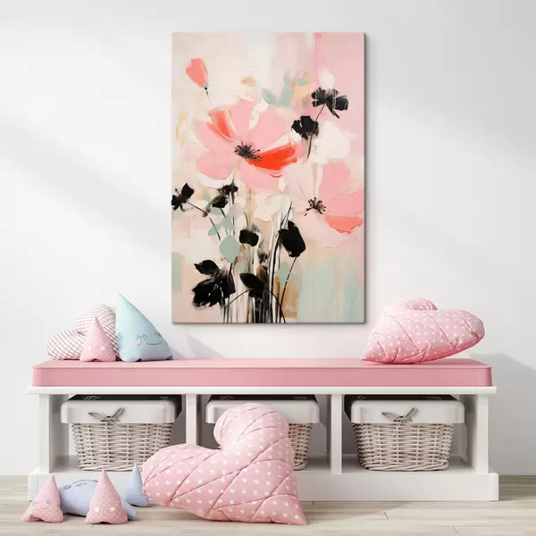 Obraz Růžové a černé květiny s listy, jemné pastelové barvy, abstraktní květinová kompozice, minimalistické umění Č. s46687