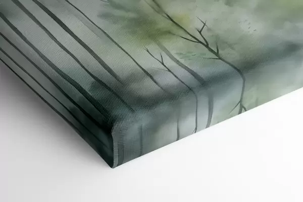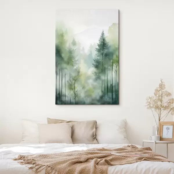 Obraz Akvarelová malba napodobující zamlžený les s vysokými borovicemi a horami v pozadí Č. s46690
