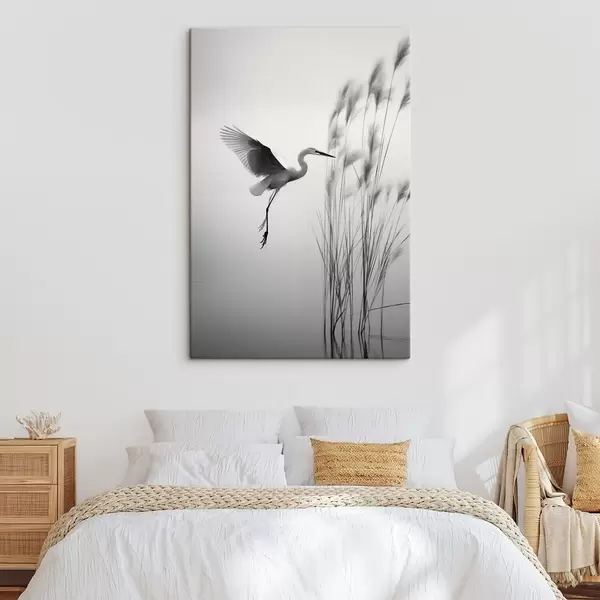 Obraz Bílá volavka s roztaženými křídly, letící poblíž vysokého rákosí, černobílá minimalistická kompozice Č. s46693