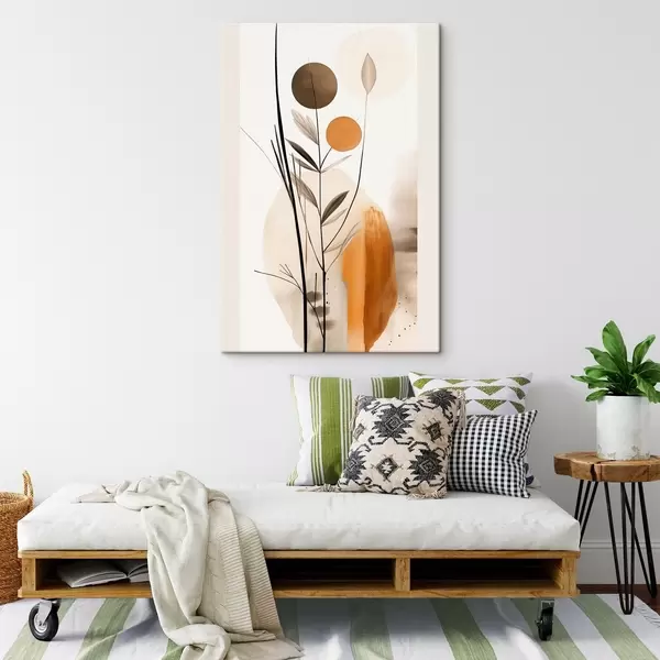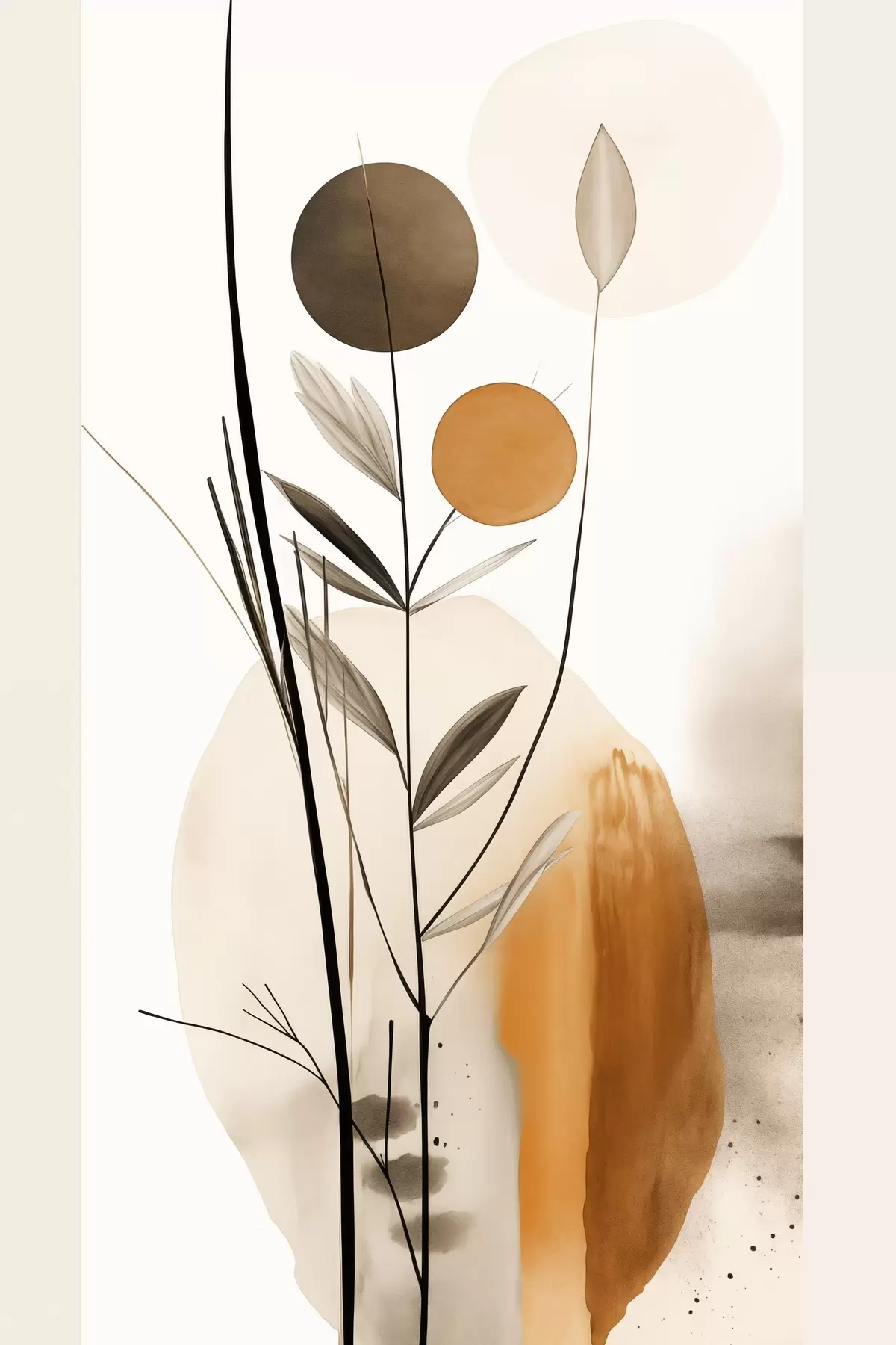 Obraz Abstraktní malba s oranžovými a šedými kruhy, listy a větvemi, moderní styl, akvarelový efekt Č. s46698